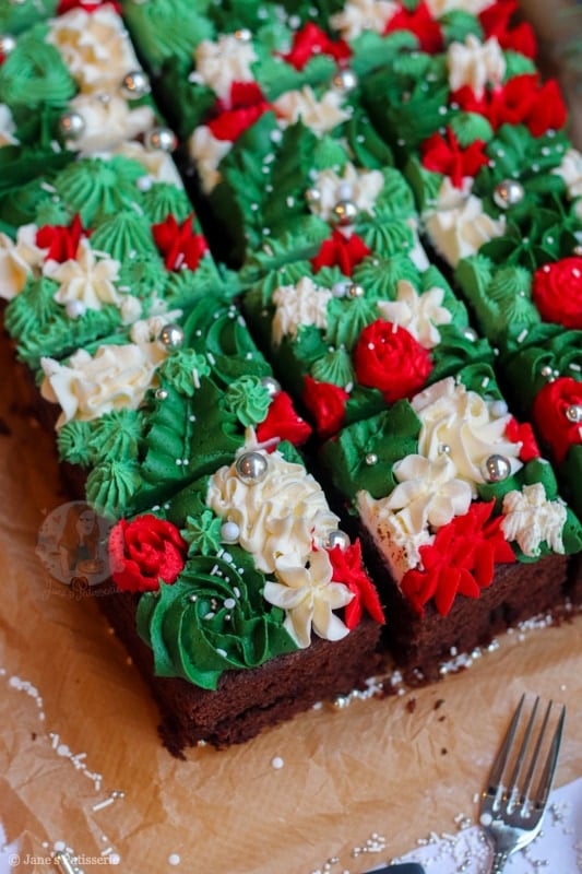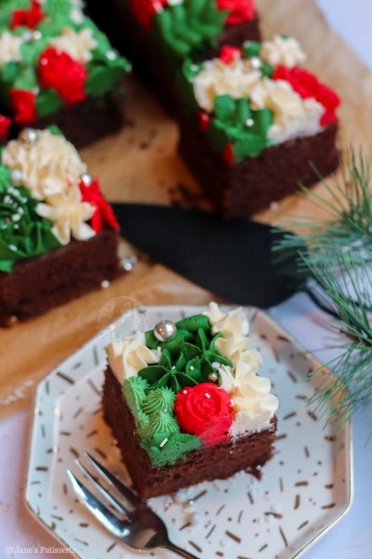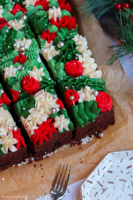 I love traybake cakes if you haven’t noticed already – my chocolate fudge traybake is one of my all time favourite cakes to make as it is just so utterly delicious. And as a complete contrast, my gin & tonic traybake is just as delicious – and so simple to make! This Christmas traybake cake is a mix of all my traybake cakes together.