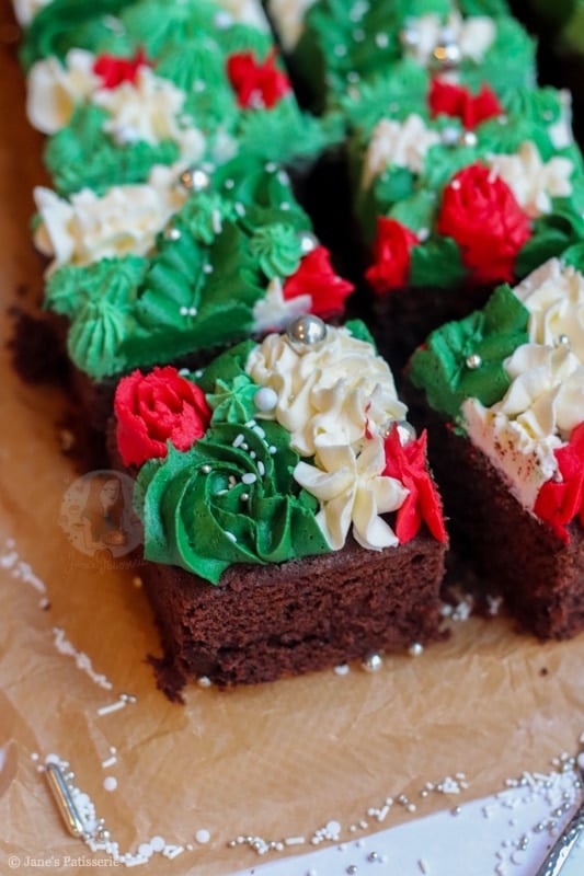 A delicious and moreish chocolate cake, topped with beautiful american buttercream frosting, in all the different festive patterns!