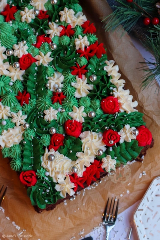 For this bake I wanted to use a classic traybake tin because when I think of a traybake cake, I think the large rectangle cakes that you can buy in a supermarket. To be fair, I would still happily absolutely devour one of those instead of making it myself, but this is a festive bake – so this recipe is amazing!