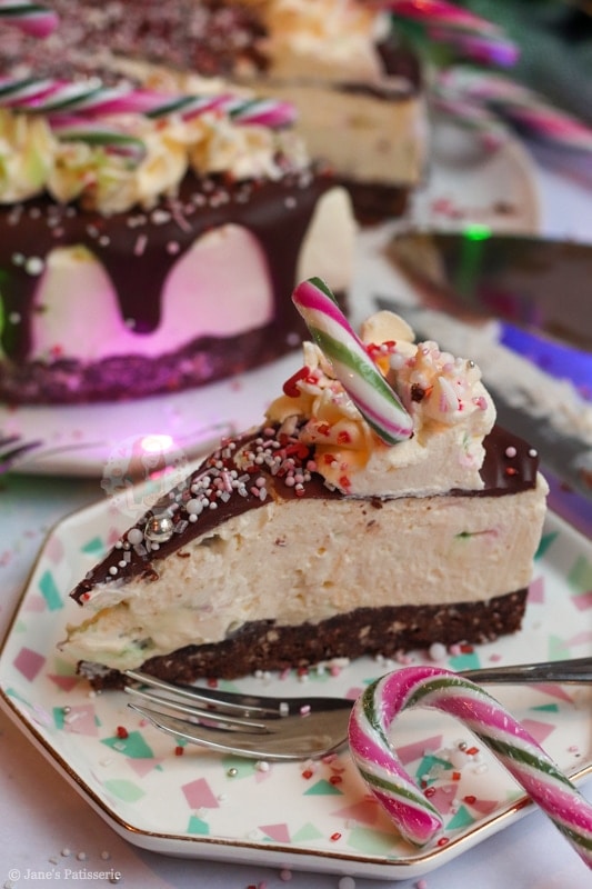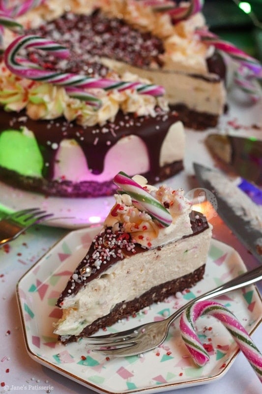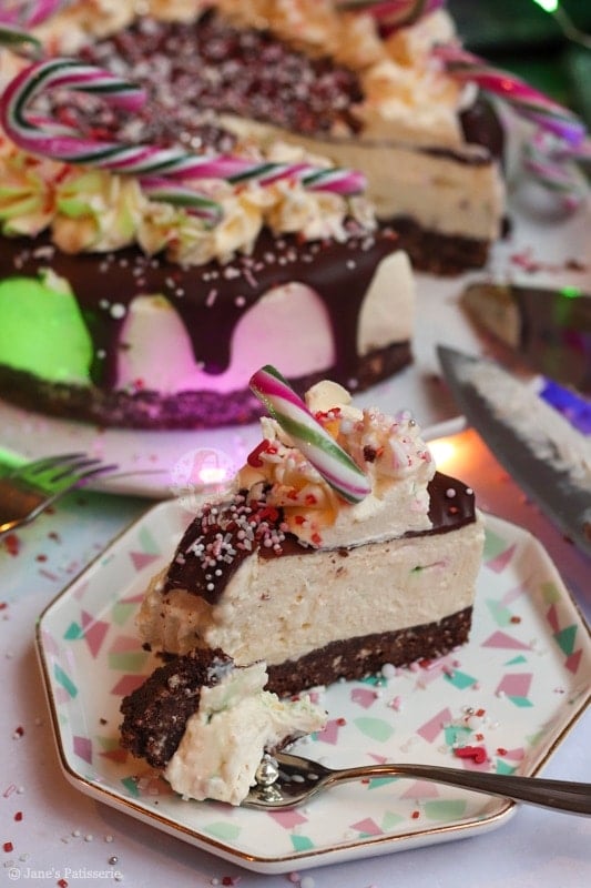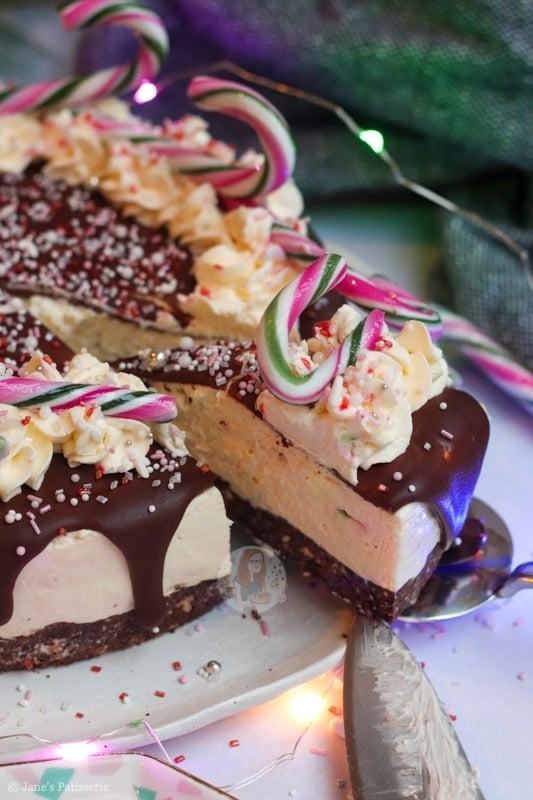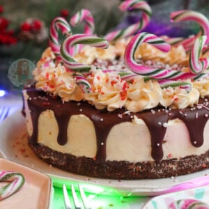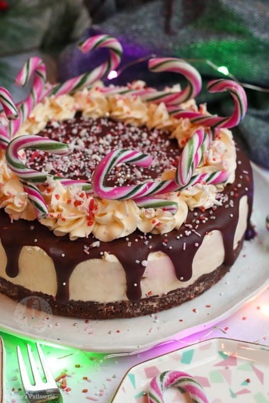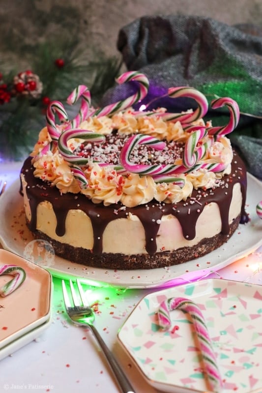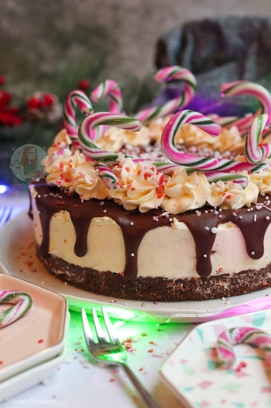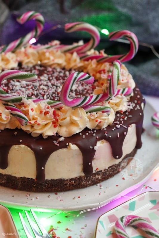 A delicious no-bake candy cane cheesecake with a chocolate biscuit base, peppermint cheesecake filling, ganache, candy canes and more! Heaven!