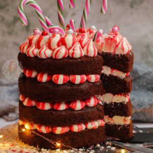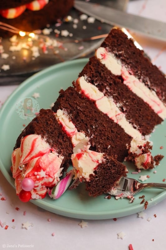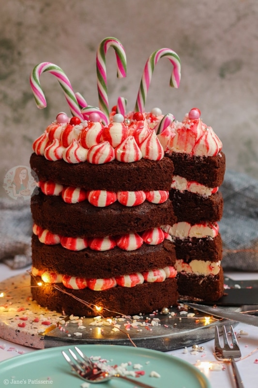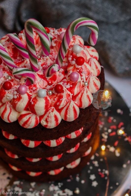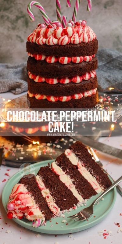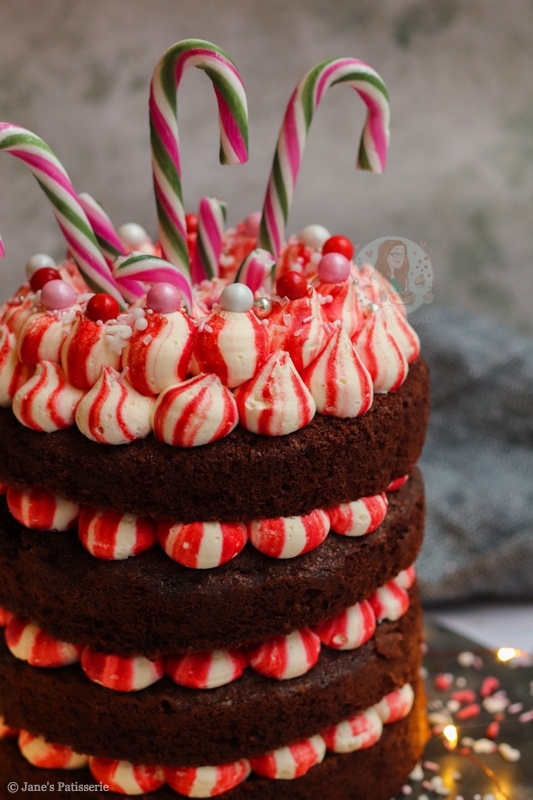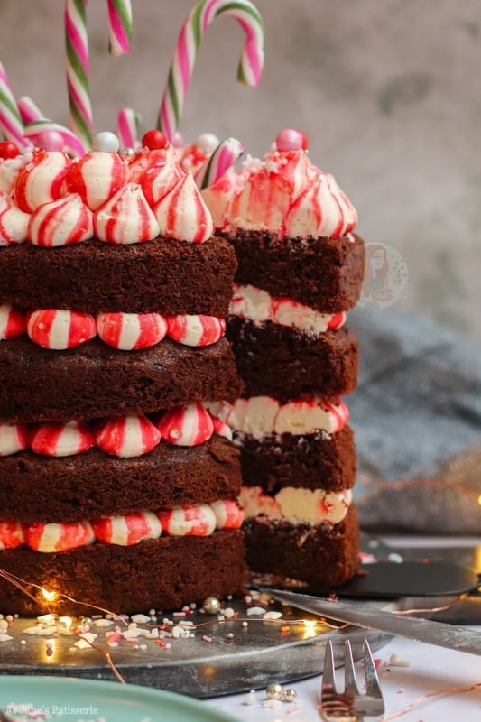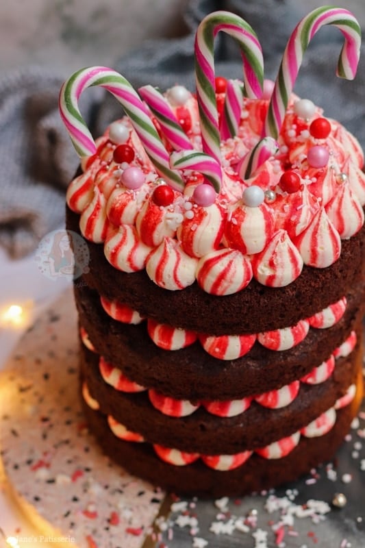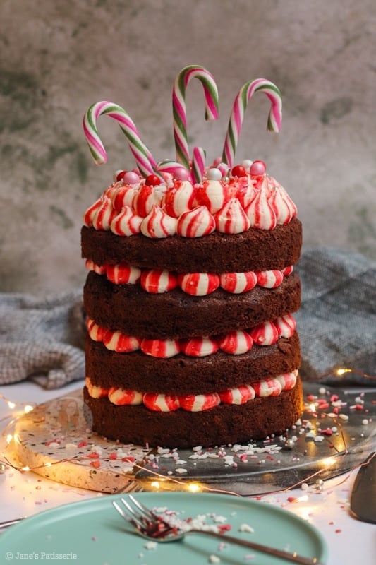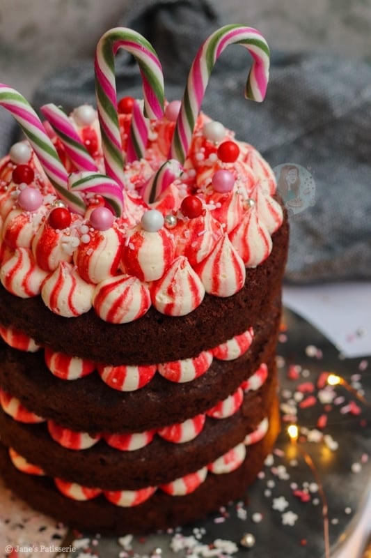 A four-layer chocolate peppermint cake with chocolate sponges, red striped peppermint buttercream frosting – and more! A delicious easy festive cake.