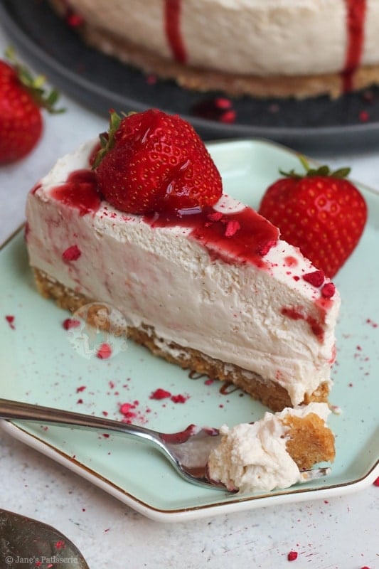 Obviously, as it’s vegan, you can’t use gelatine to set the cheesecake. I don’t in this recipe anyway, but if you are worried, it’s best to use a vegan alternative such as agar agar, or vege-gel, just to make sure you get the best set. If you find once removing from the tin that the cheesecake is a bit soft, you may need to put it in the freezer for a bit to help serve it, but this is a risk of the lower fat vegan ingredients!