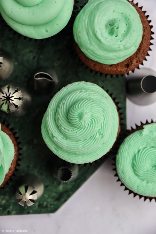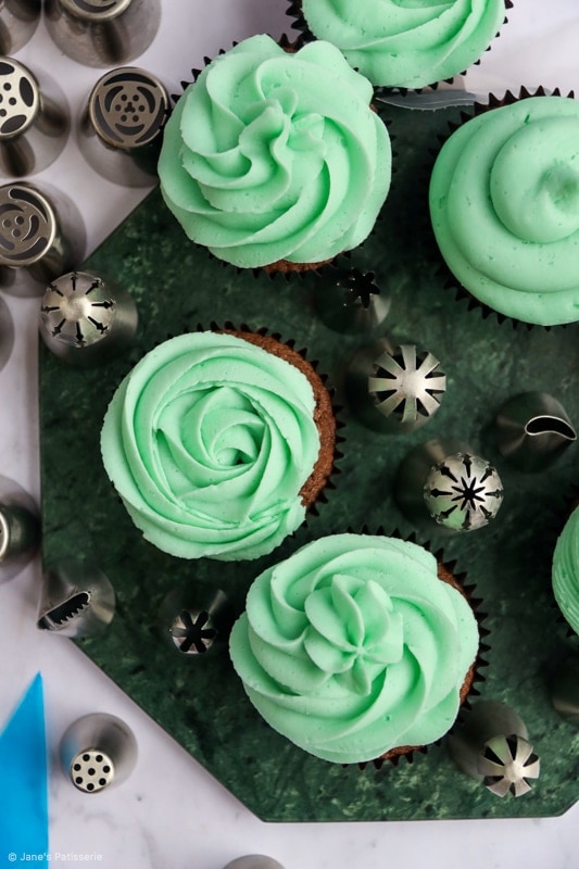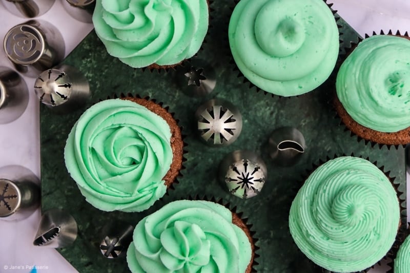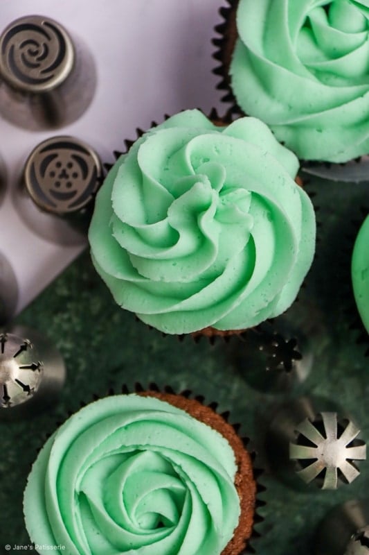 You can swirl a jumbo round piping tip-up really easily, or if you use a large enough one as I do, you can pipe one large blob of buttercream, to make it easier to top with something – as I do in my ferrero rocher cupcakes!