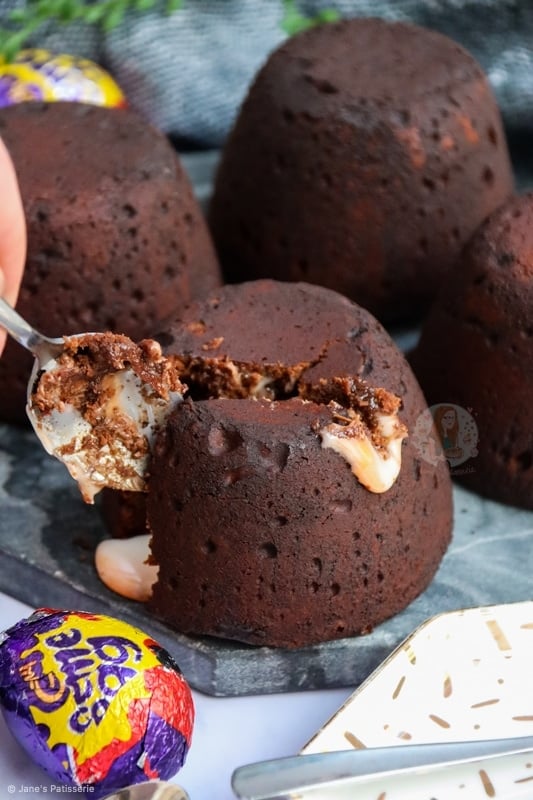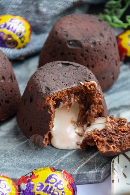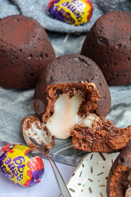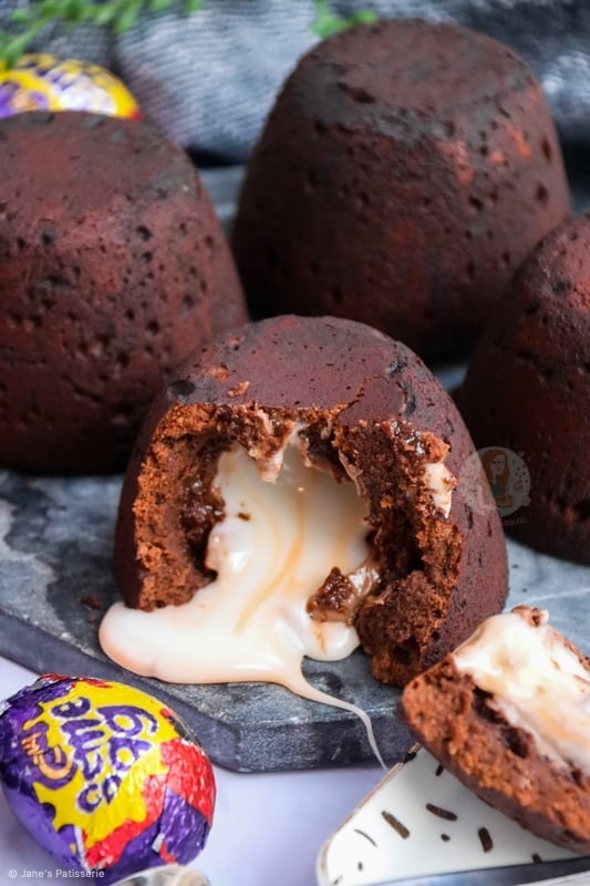 - Split the mixture evenly between the four pudding moulds, and carefully press in a frozen creme egg (on it's side). Press the creme egg in fully, and cover the top if you can still see it with mixture.
