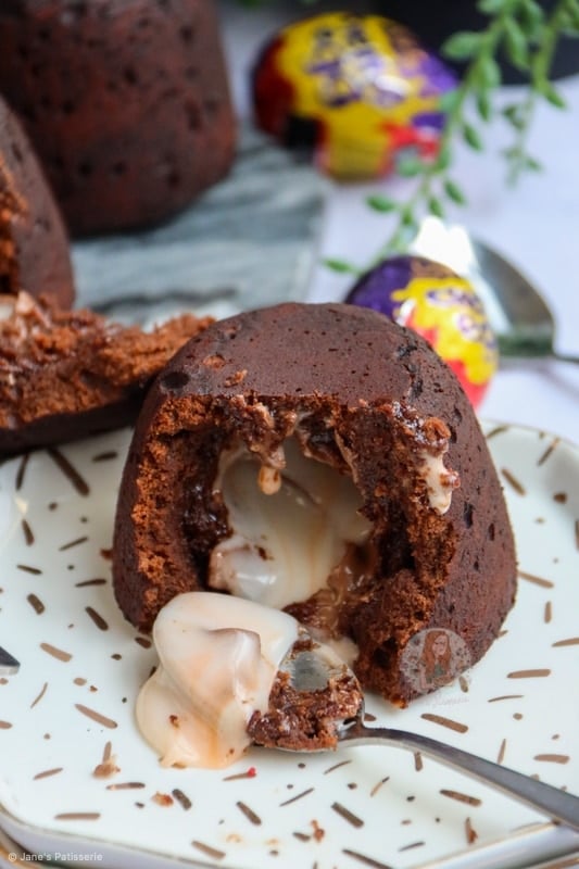 These creme egg fondants are made up of a few ingredients – butter, chocolate, eggs, sugar and flour – and then stuffed with a frozen creme egg. You do also need some butter and some cocoa powder to line your pudding moulds though.