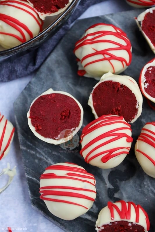 You can prep these ahead and freeze them at this stage, or you can freeze them after decorating. Either way, it’s best to freeze the red velvet cake truffles for at least an hour before you coat them, as if they are too soft they may disintegrate slightly.
