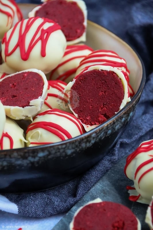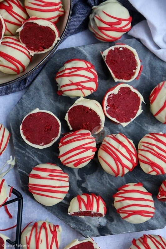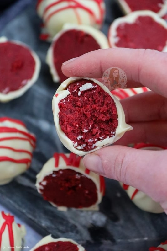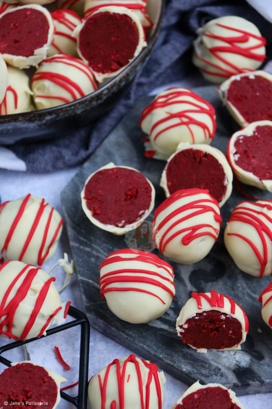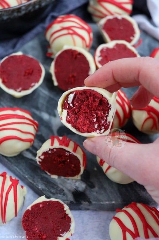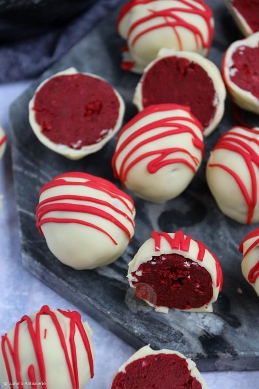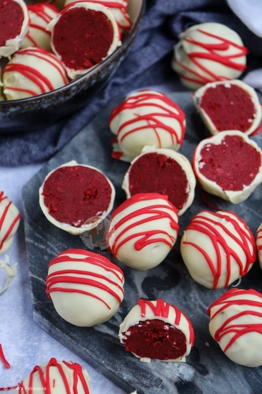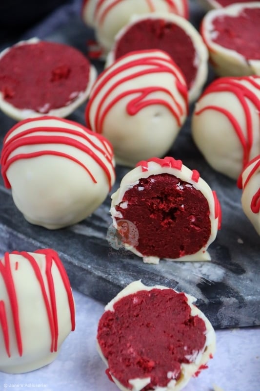 Delightful red velvet cake truffles with a red velvet and cream cheese centre, coated in white chocolate!