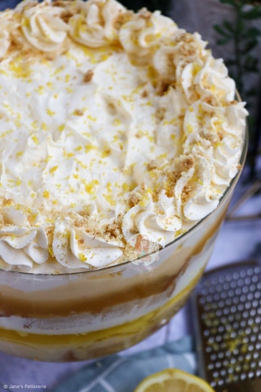 I finished the trifle off with some lemon zest sprinkled over, and some biscuit crumbs to act like sprinkles as I thought it looked nice – but again, this is up to you. I used a 21cm trifle bowl for this – but trifle bowls really can vary in size! You don’t have to really use a trifle bowl exactly, just a large dish that is deep enough -good luck finding one though!