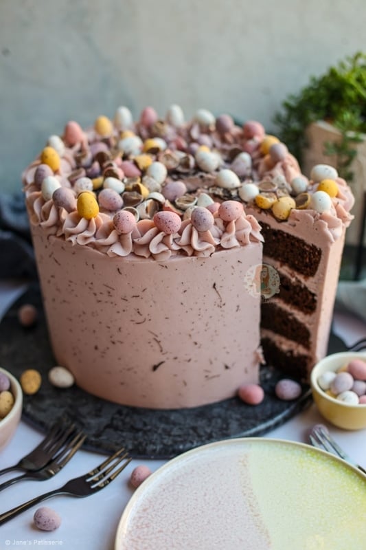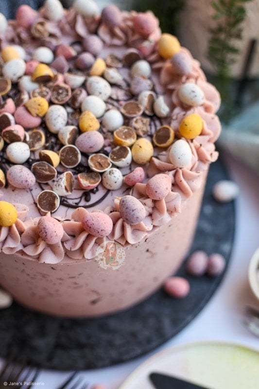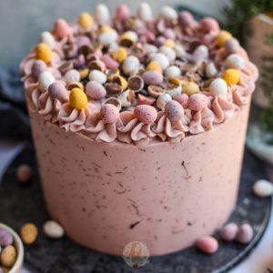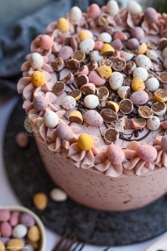 I used a pastry brush and flicked the brush ends to create a speckle, as well as flicking all of the brush for slightly bigger ‘speckle’ bits. It’s messy, but it is so much fun to do! I then used leftover buttercream around the top, and topped it with mini eggs because why not?!