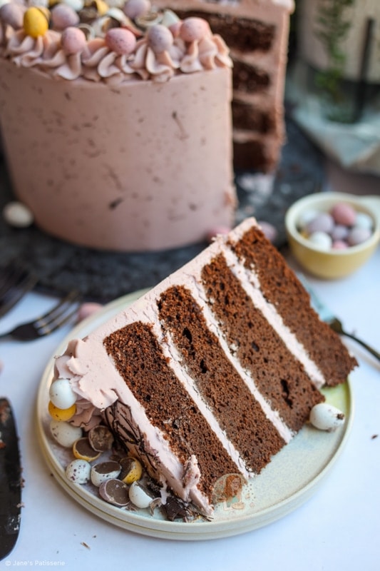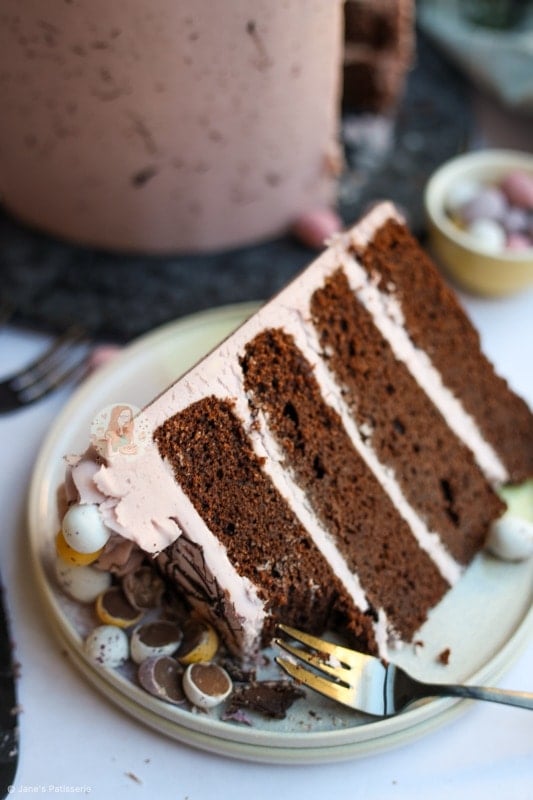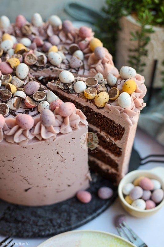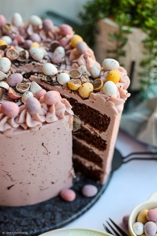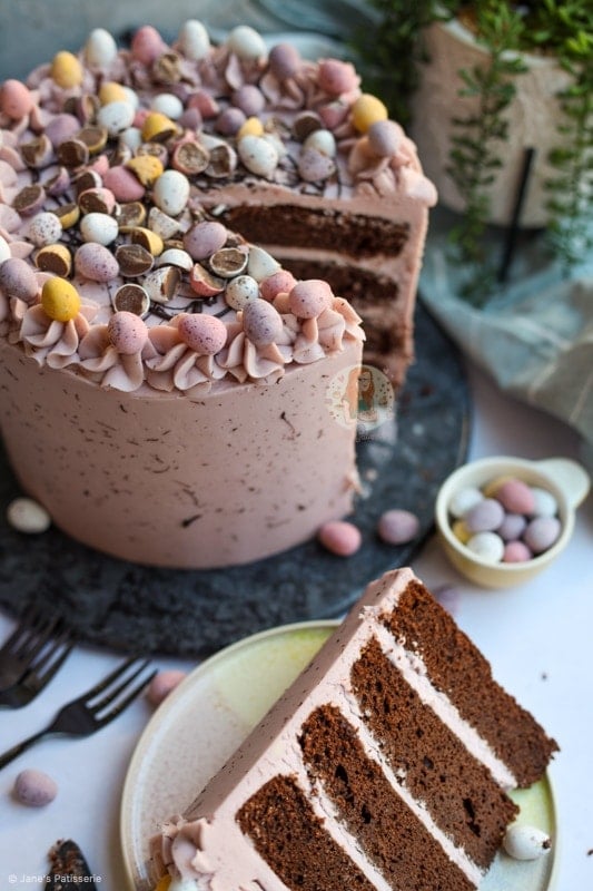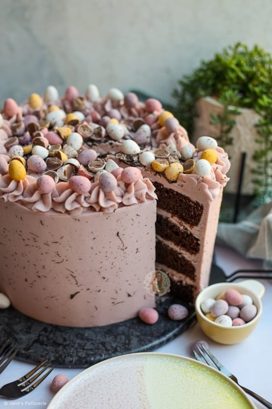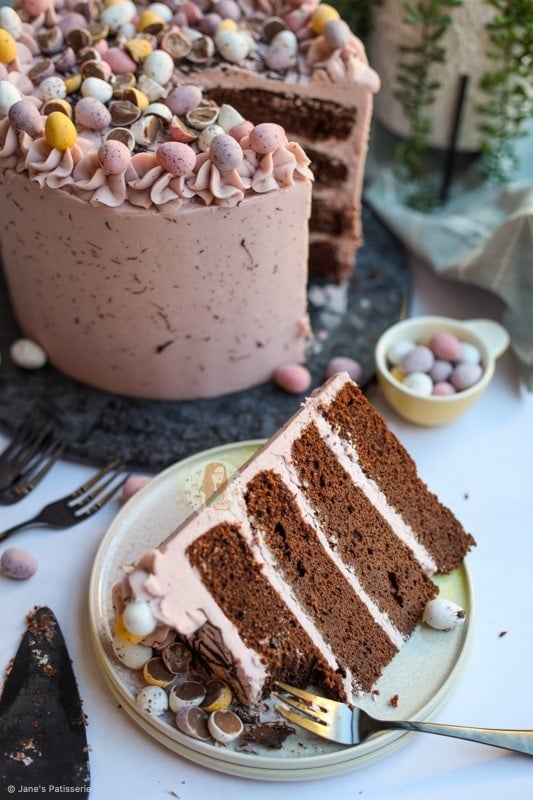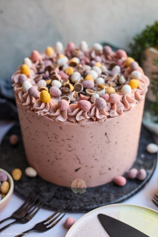 A fun and delicious showstopping Easter speckled cake with a four-layer chocolate sponge, and vanilla buttercream frosting!