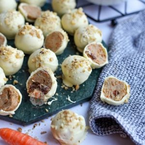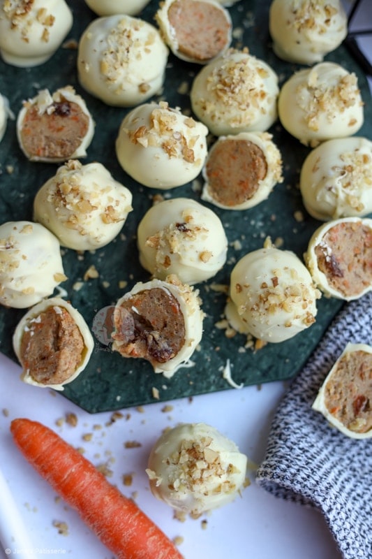 Easy and delicious carrot cake truffles with a homemade carrot cake and cream cheese truffle filling, coated in white chocolate and topped with walnuts!