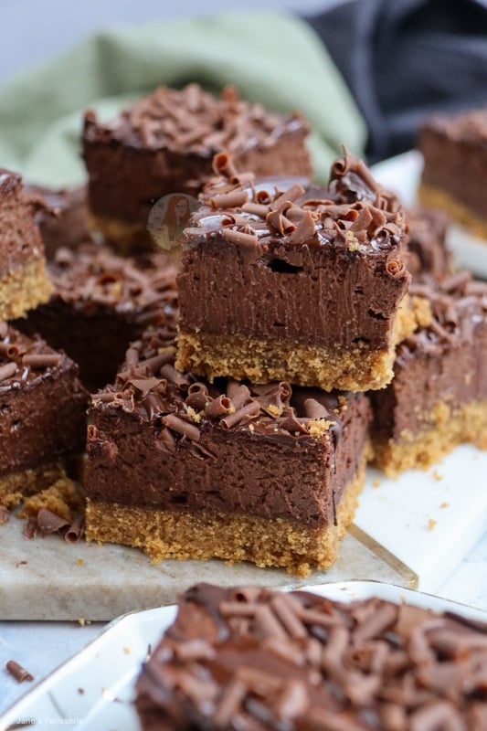 Delicious baked chocolate cheesecake bars with a biscuit base, creamy and delicious chocolate cheesecake filling, and a chocolate drizzle topping!