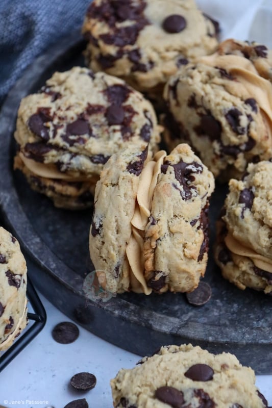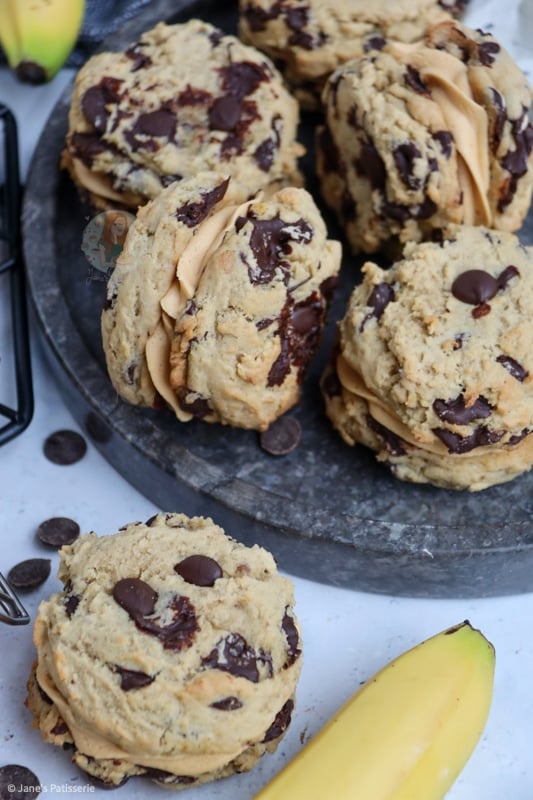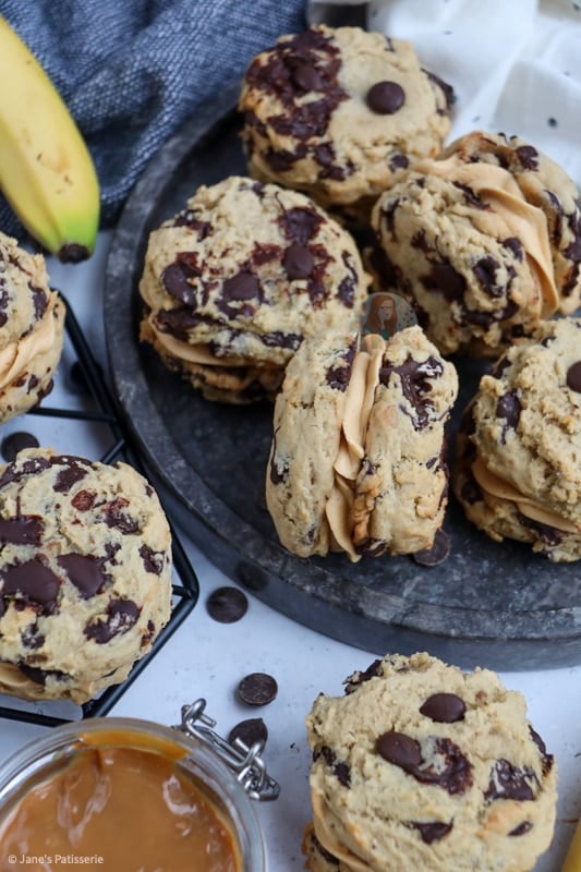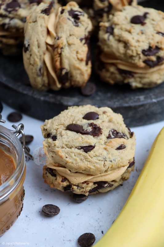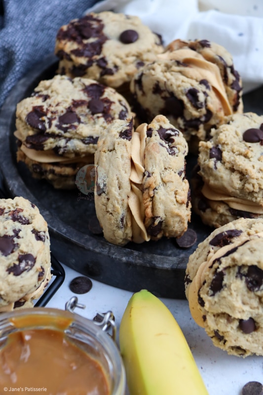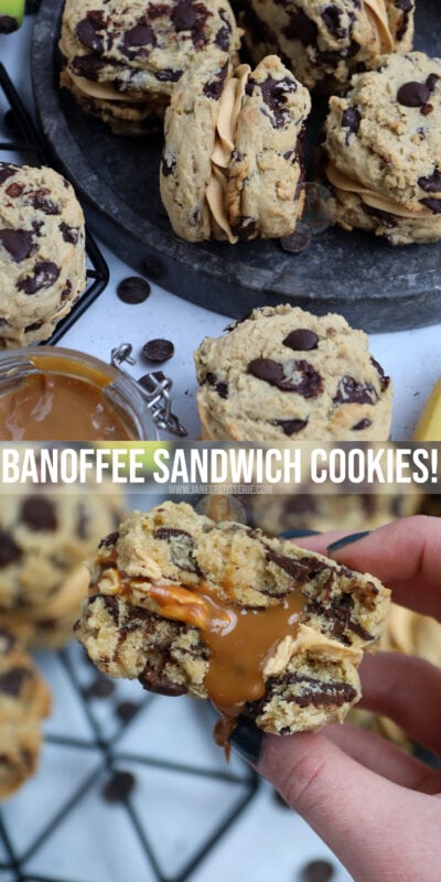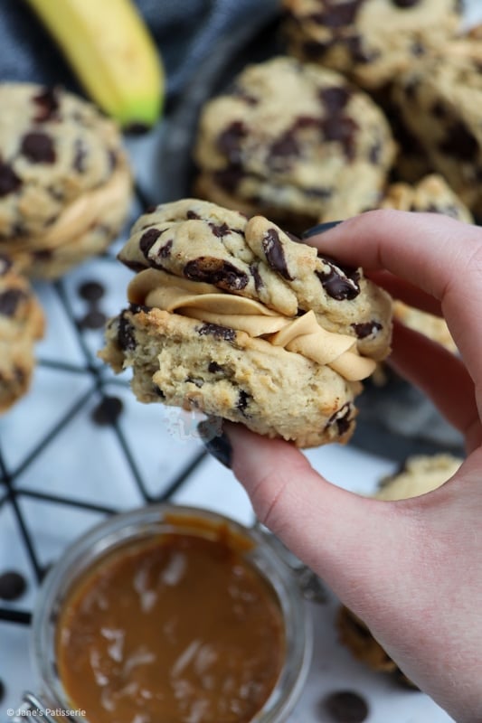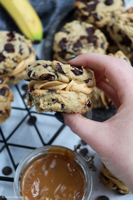 Delicious chocolate chip and banana cookies, sandwiched with salted caramel buttercream and caramel sauce… Banoffee sandwich cookies are NEXT LEVEL!