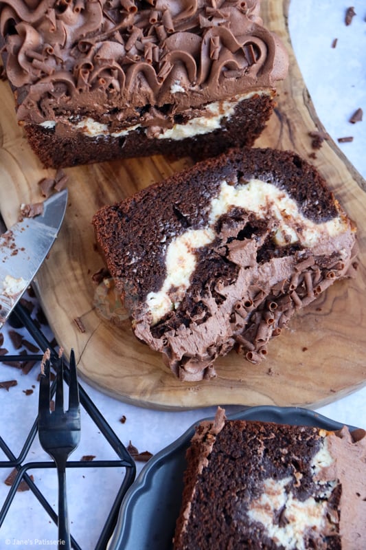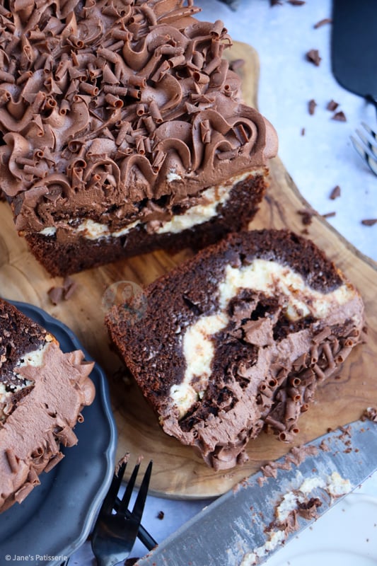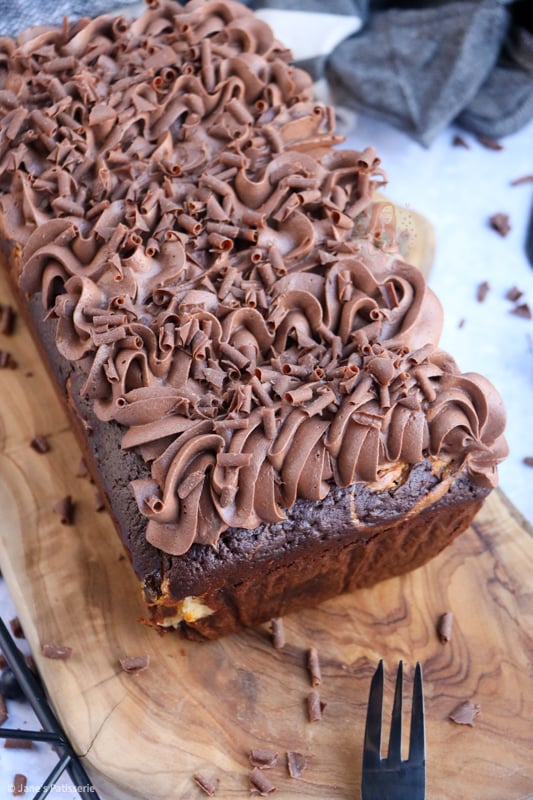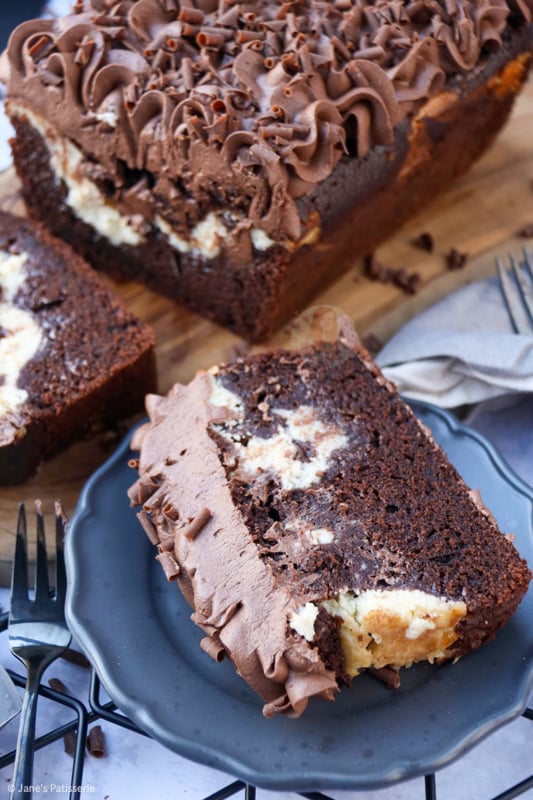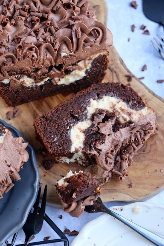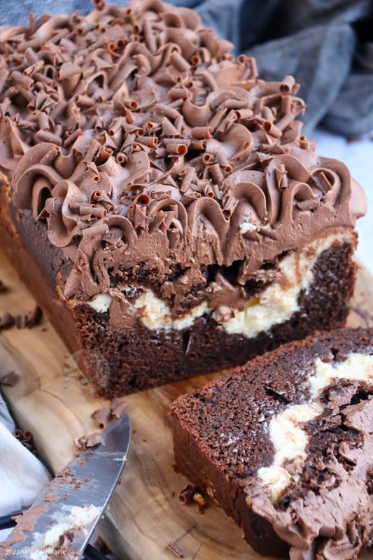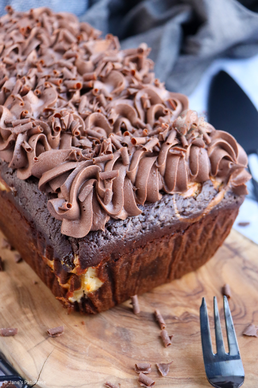 A delicious chocolate loaf cake, stuffed with a layer of baked vanilla cheesecake, topped with silky smooth frosting.