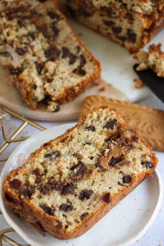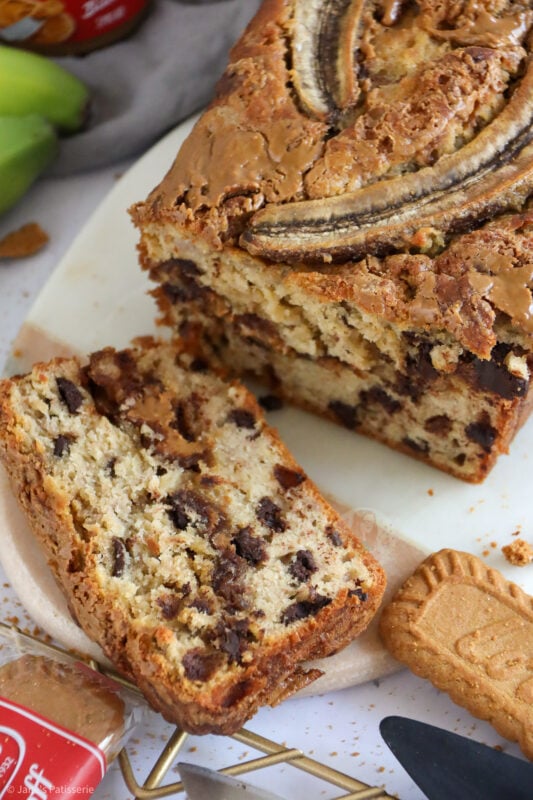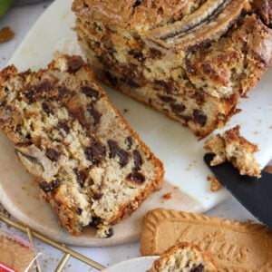 Deliciously easy Biscoff banana bread with a simple chocolate chip banana bread base, with Biscoff swirled throughout!