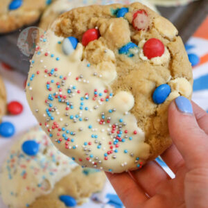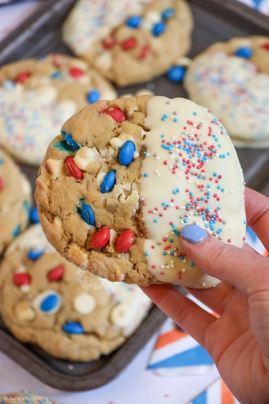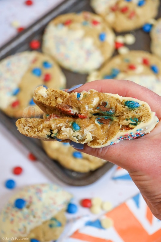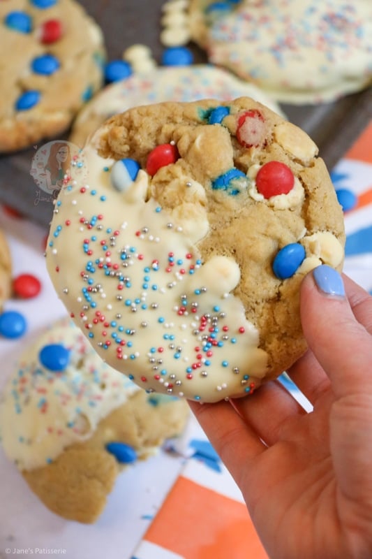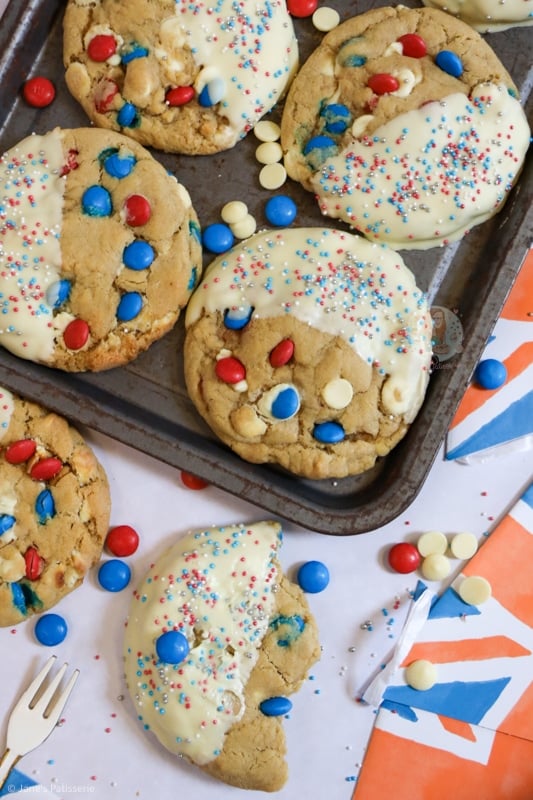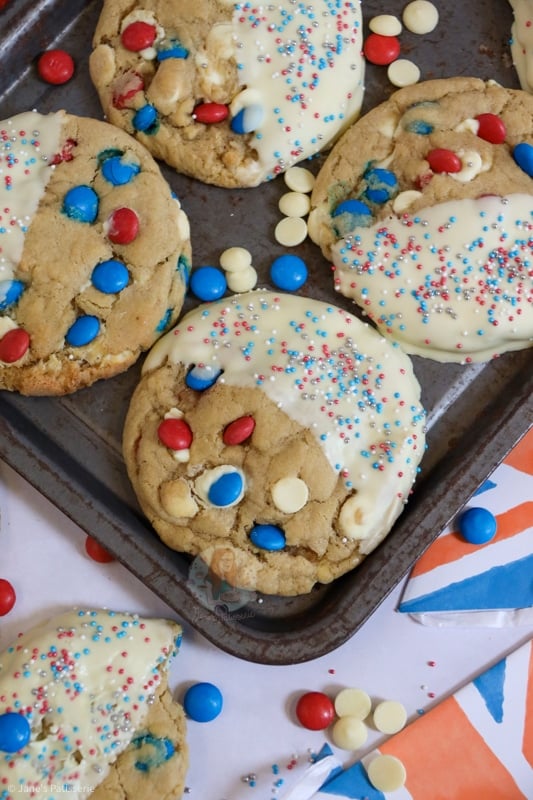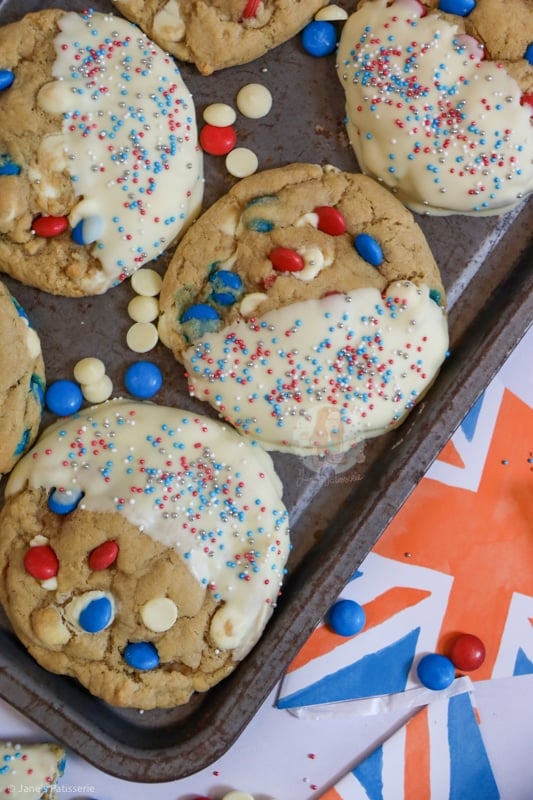 Delicious white chocolate and M&M NYC Cookies, with a red, white and blue theme for the Jubilee weekend… Jubilee cookies!