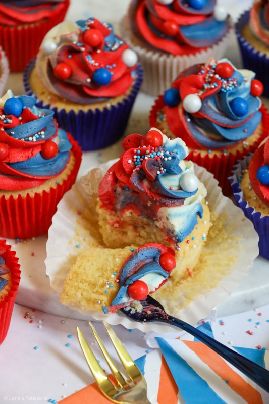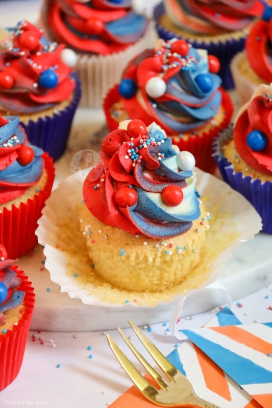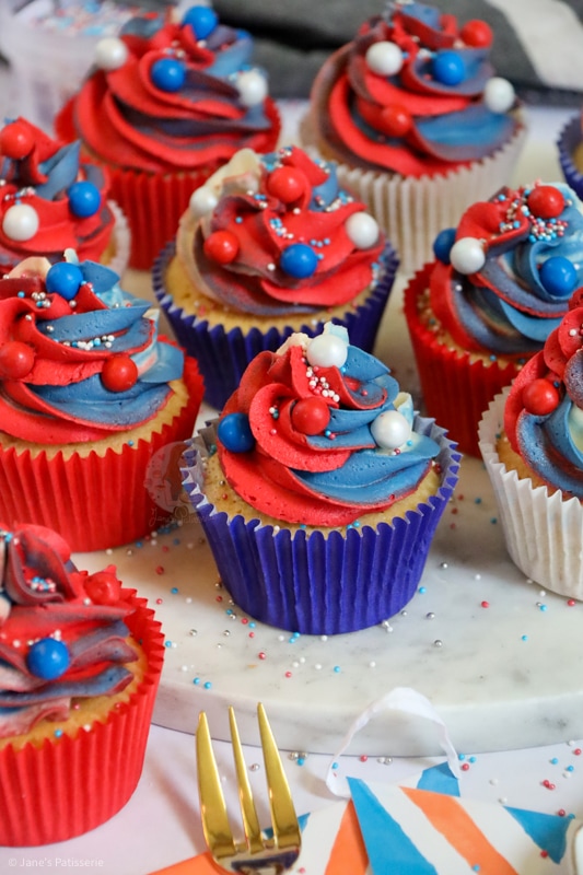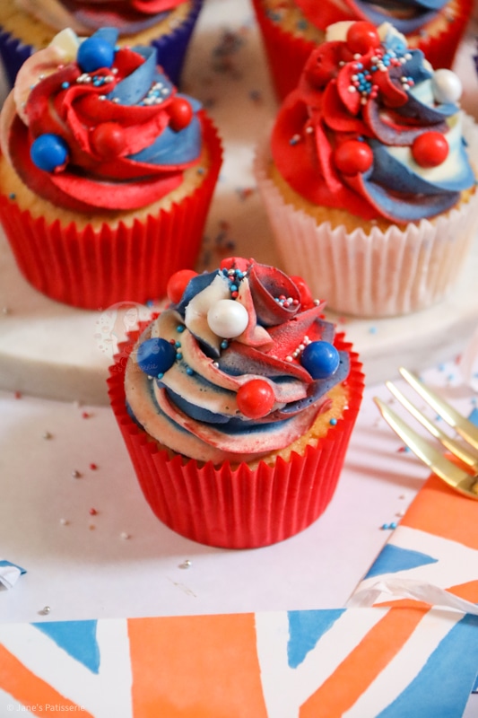 I used a basic vanilla recipe for these jubilee cupcakes as I wanted to make sure that it’s a flavour that most people would love, and also a flavour that is easy to colour! We all know a chocolate bake is going to be very hard to colour to red, white and blue.