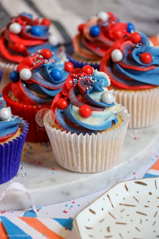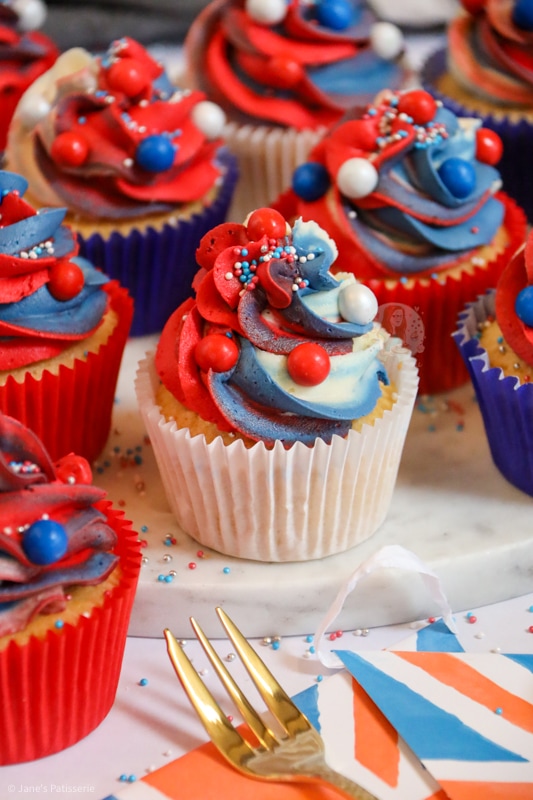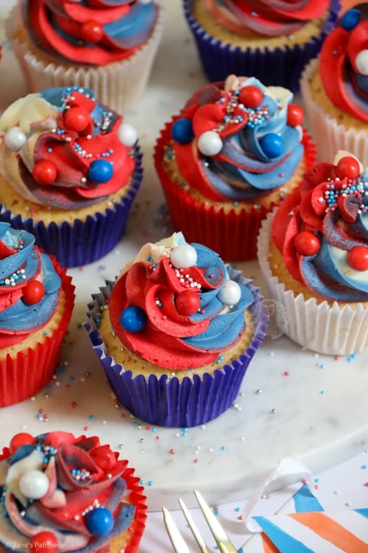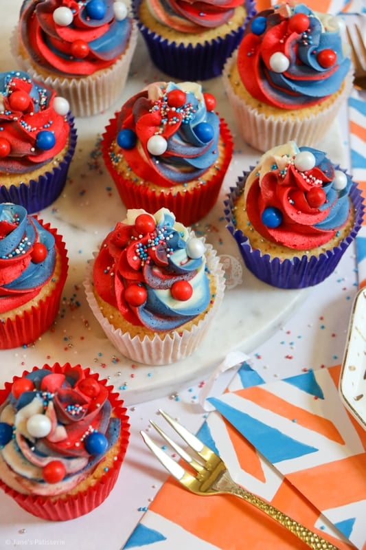 Easy and scrumptious Jubilee cupcakes with a vanilla cupcake sponge, and red, white and blue vanilla buttercream frosting!