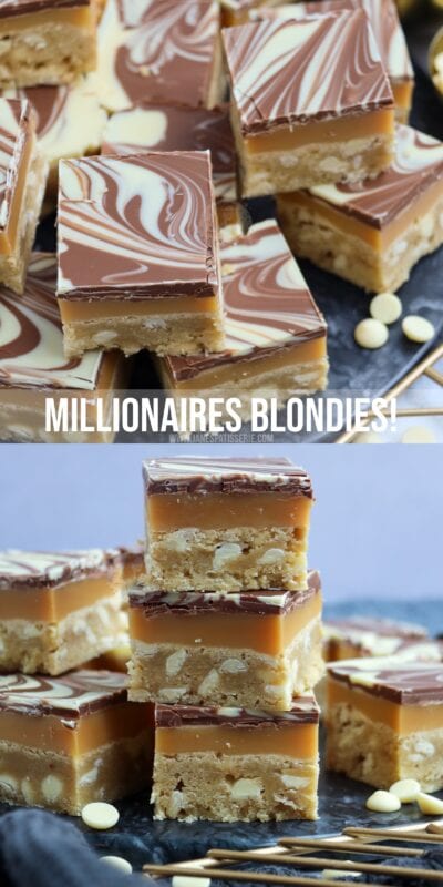 White chocolate chip blondies, homemade caramel, and swirled chocolate make the best millionaires blondies ever!