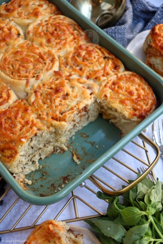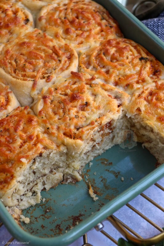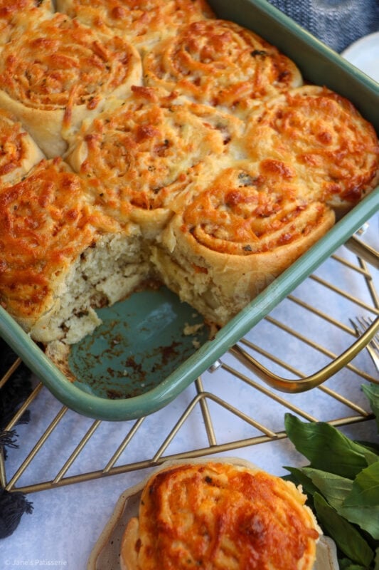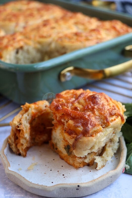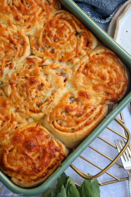 Roll out the dough, fill how you please, and then make your rolls! It’s best to prove the dough again at this point so that you don’t have a dense bread texture, but after proving for the second time (which is much quicker!), I then top with even more cheese and bake.
