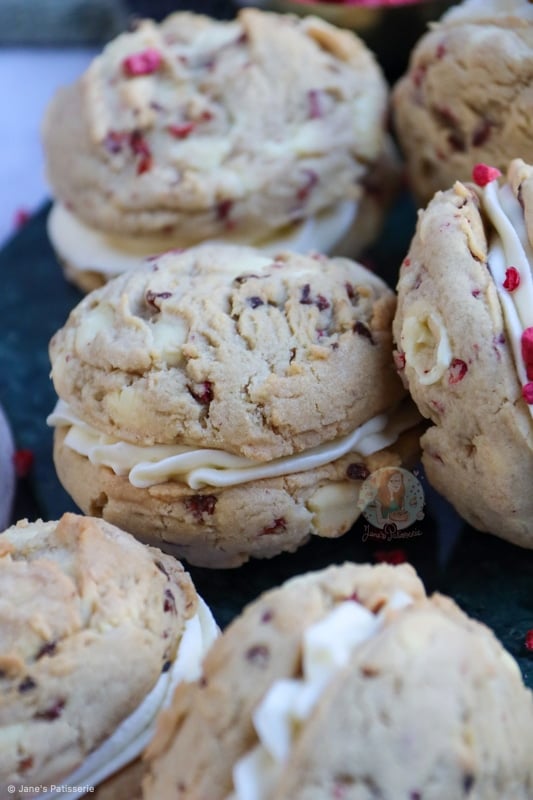 Delicious white chocolate and raspberry cheesecake cookies with soft delicious cookies and cheesecake sandwiched together!