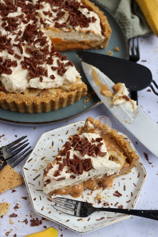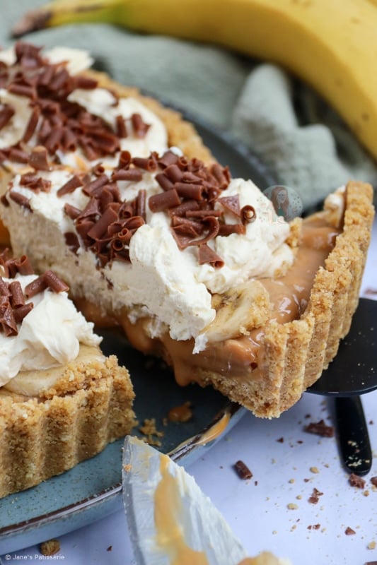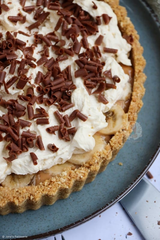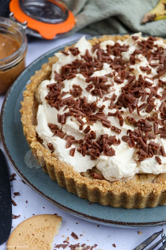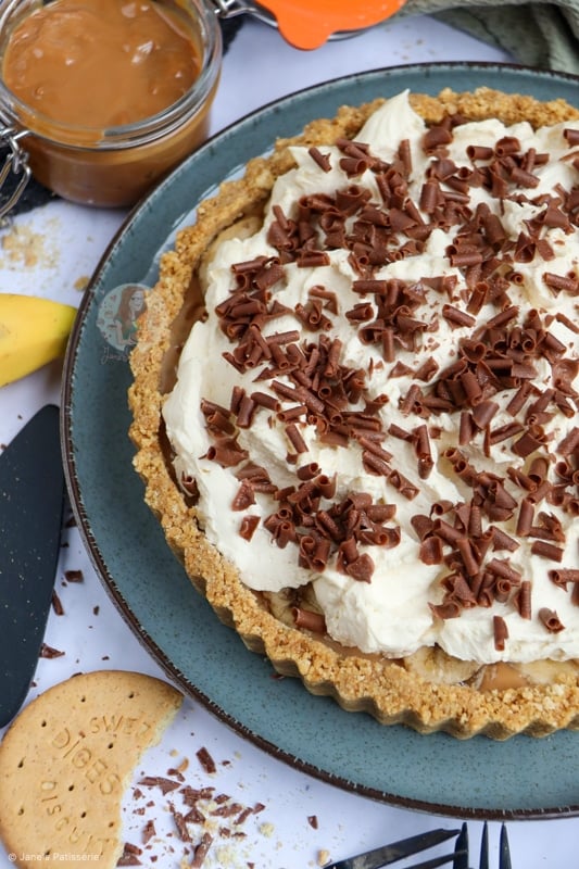 A delicious and easy no-bake banoffee pie! A delicious classic of a biscuit base, caramel, banana, cream and more!