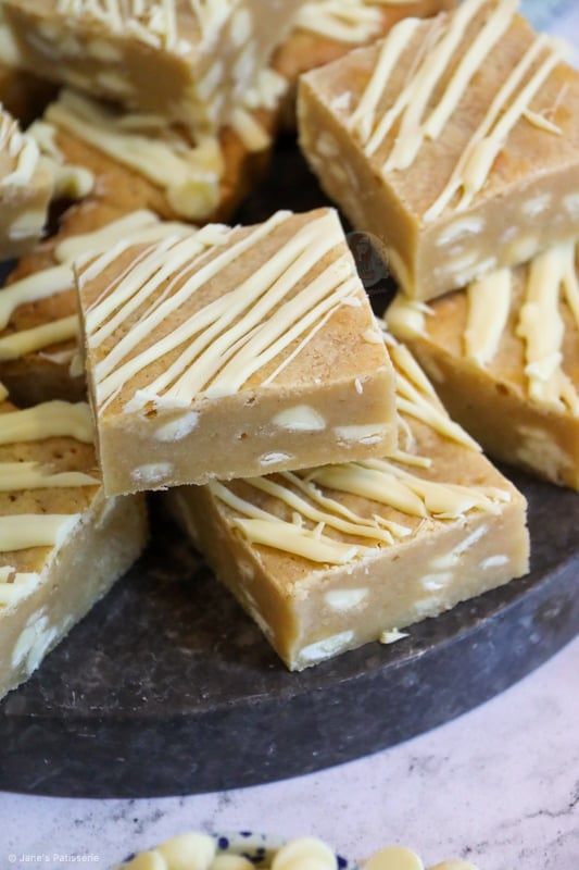 For me, a blondie is a ‘white’ version of a brownie. This is however my first recipe to include melted white chocolate in the base because it took so long to perfect the recipe to make sure it wasn’t greasy or horrible.