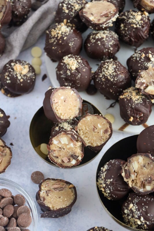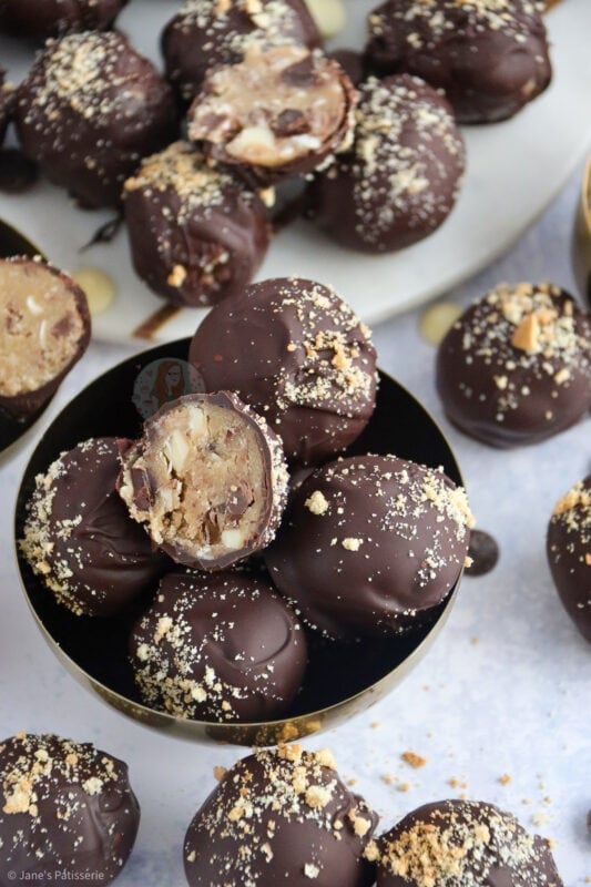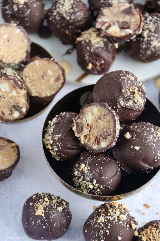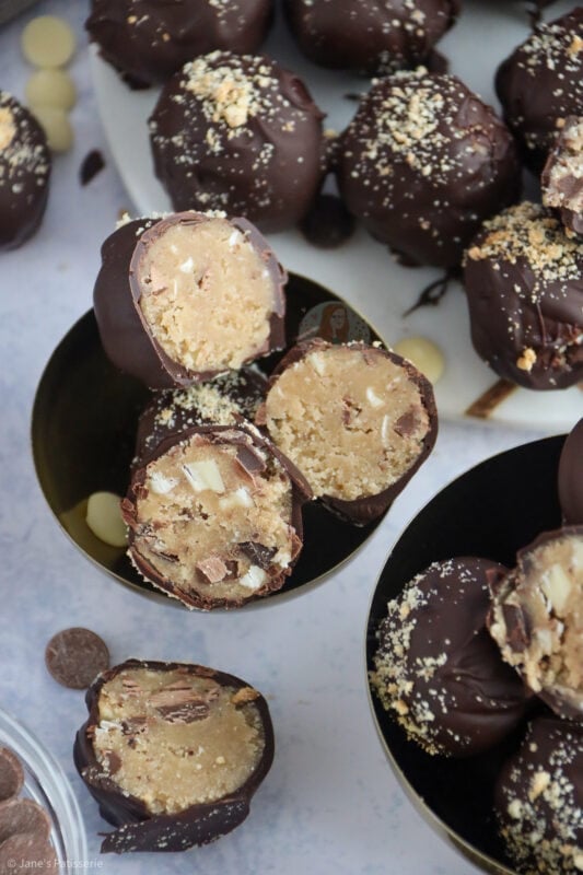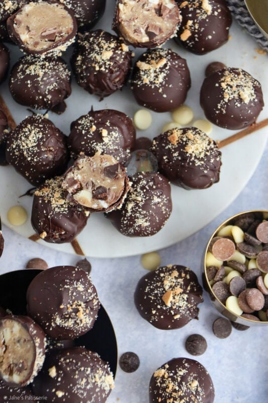 Decoration of truffles is always the easiest bit in my mind, even if a little messy. I always use a melted chocolate base because I find it best! I start with the truffles frozen so that the warmth of the chocolate can’t melt the truffles, even if they are sturdy like these cookie dough truffles.