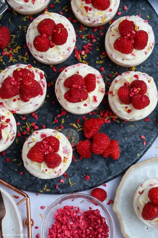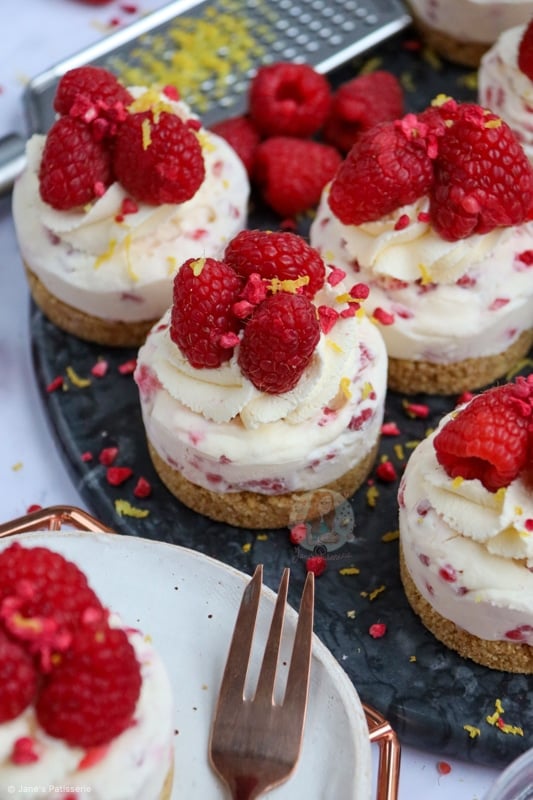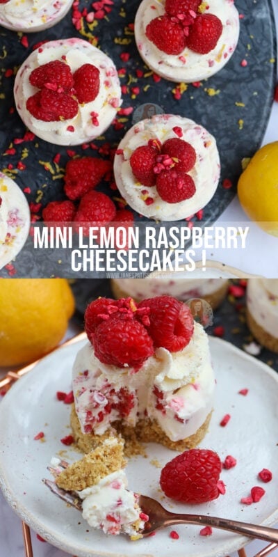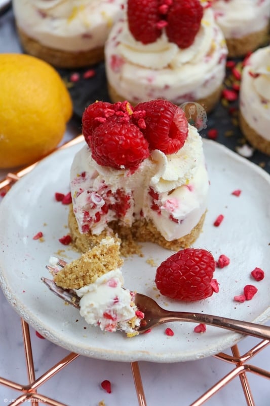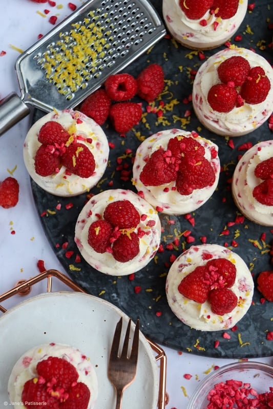 For desserts like these mini lemon & raspberry cheesecakes its so easy to decorate them however you fancy. I know mine look a bit fancy, but honestly the decoration is so simple and I love it! A little swirl of freshly whipped cream, some fresh raspberries, freeze dried raspberries and lemon zest just look stunning!
