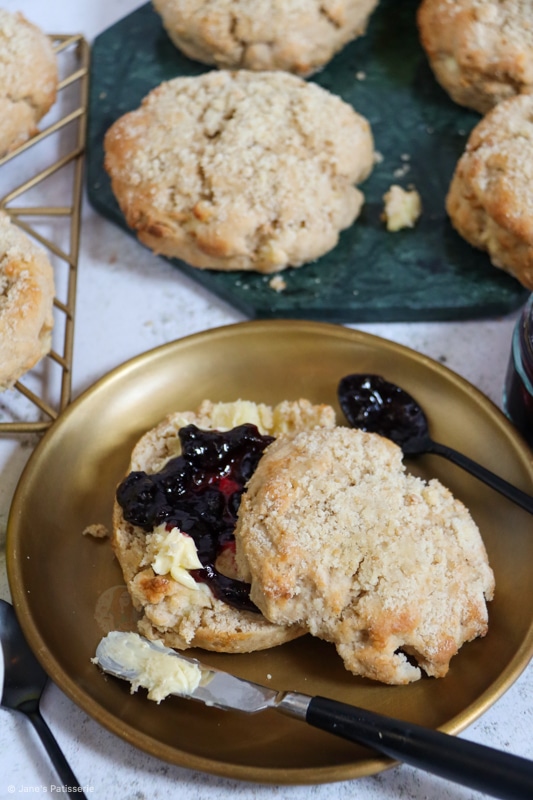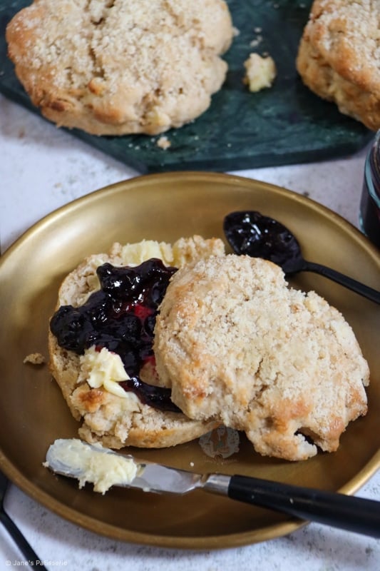 You can obviously serve scones however you fancy… cream first? jam first? the eternal debate. However, I love cream and blackberry jam with these because the combination is utterly delicious.