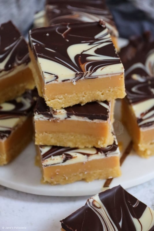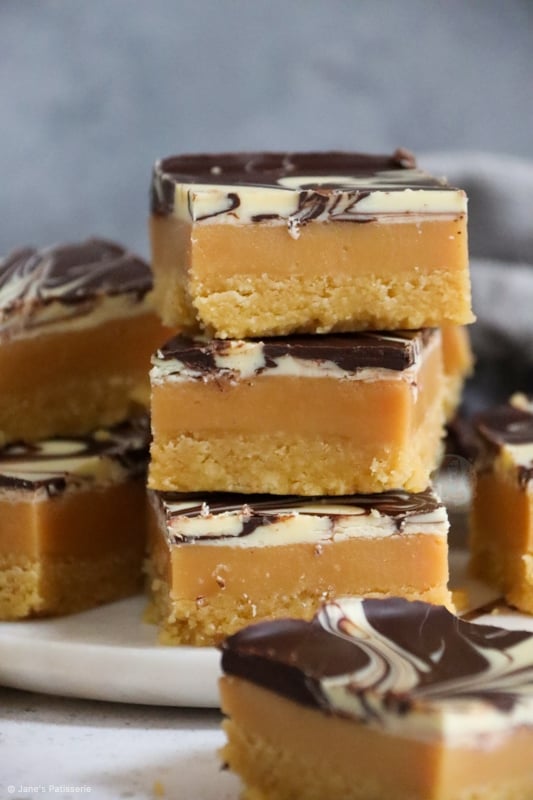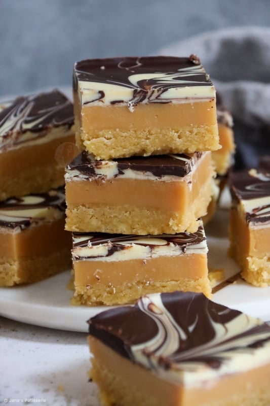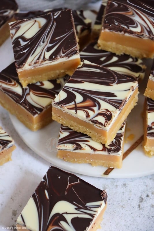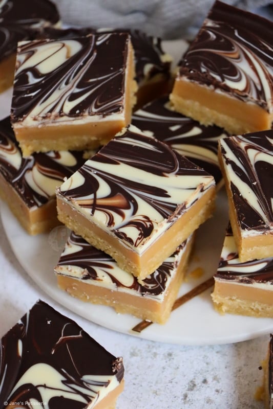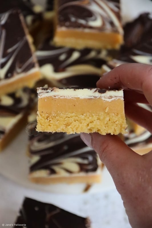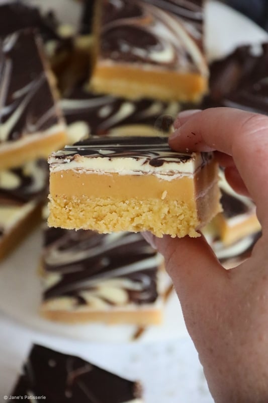 Whilst I love all of these recipes, I have had endless requests for a ‘no-bake’ version which is super easy, and doesn’t use an oven… so here it is. A biscuit base with shortbread, a caramel made in the microwave, and chocolate! Easy!