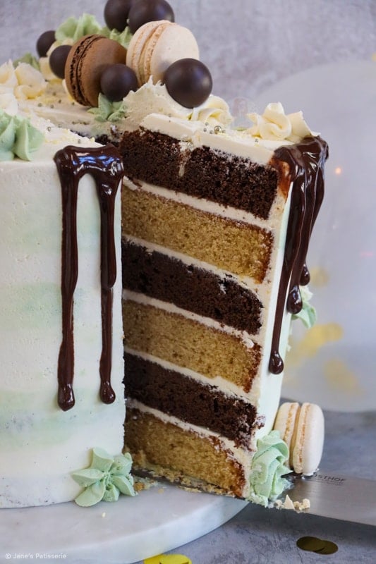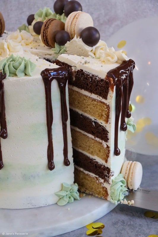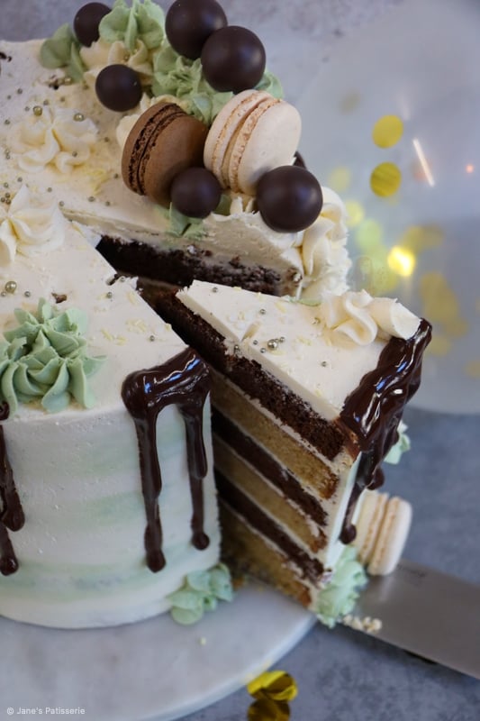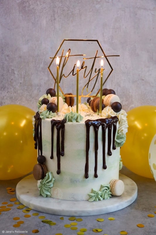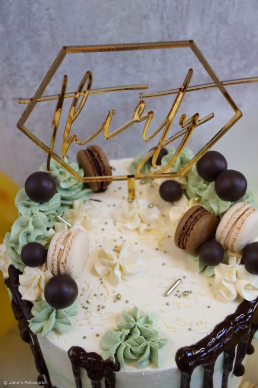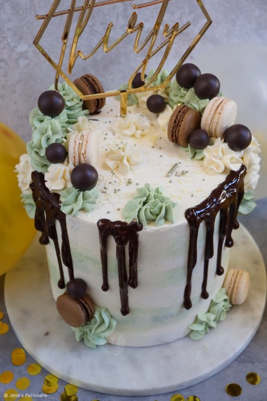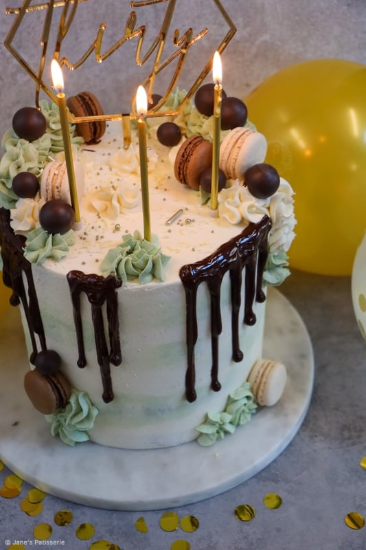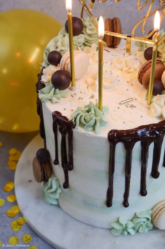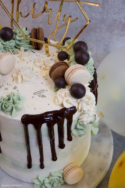 The decoration may not be to everyones taste, but it’s just a bit of fun. I smooth the white buttercream around the edge until smooth, then add on little dashes of the green colouring and smooth again to create the look. I then added on swirls of leftover buttercream, macarons, sprinkles, the drip and so on.