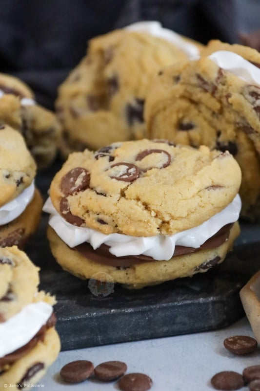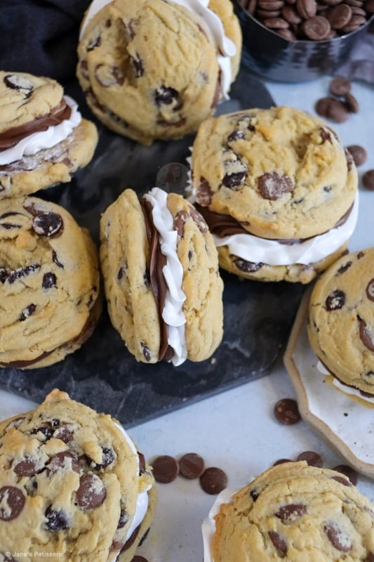 The cookie dough is a basic chocolate chip cookie that you can get from my NYC chocolate chip cookie recipe, or other cookies on my website. They’re measured with a 5cm scoop to bake to get a consistent size of cookie. You don’t want them too large as you have to sandwich two cookies together and that really would be overload if you used NYC size.
