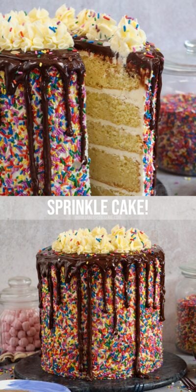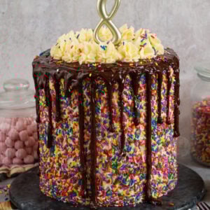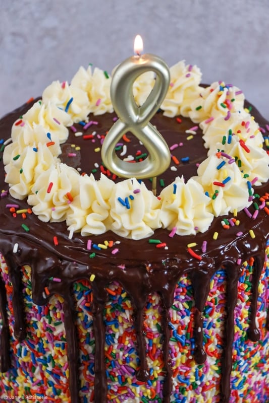 A delicious 8″ vanilla sprinkle cake, with vanilla buttercream frosting and covered in sprinkles – to celebrate my blogs 8th birthday!!