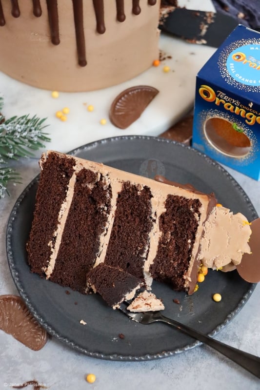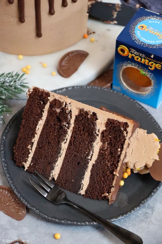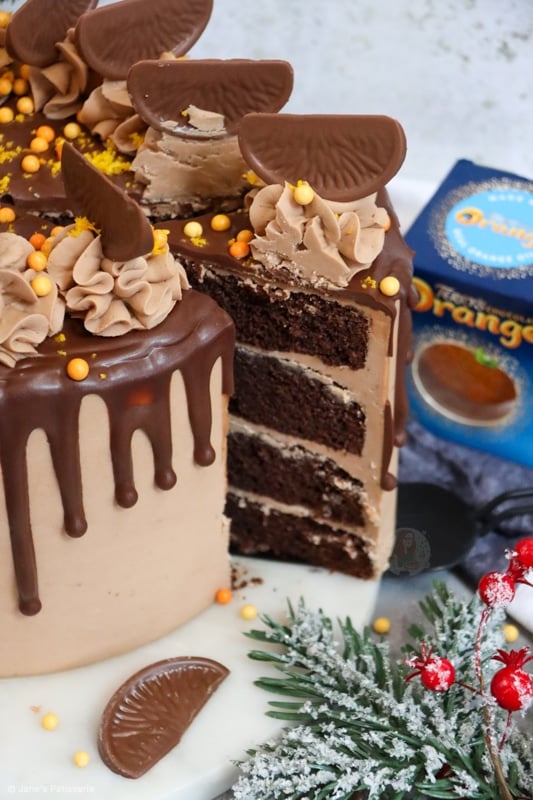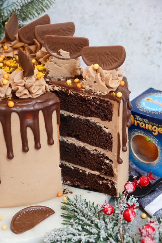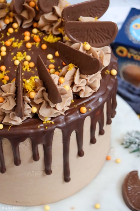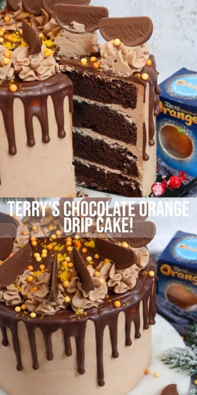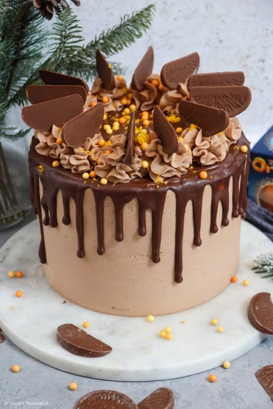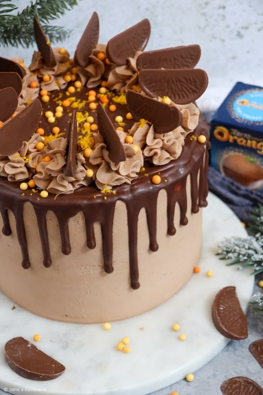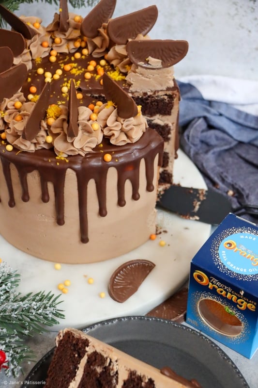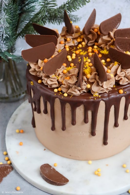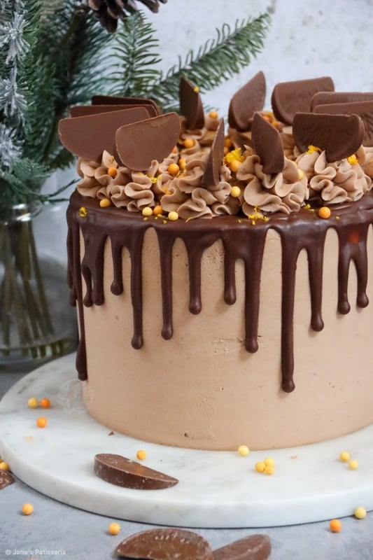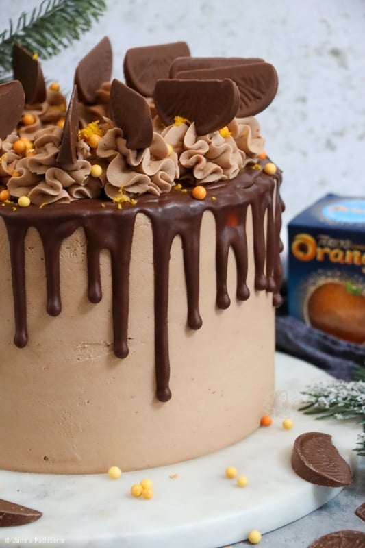 A four-layer terry’s chocolate orange drip cake with chocolate orange sponges, buttercream, drip and more!