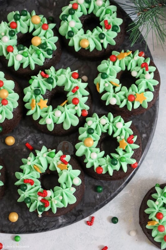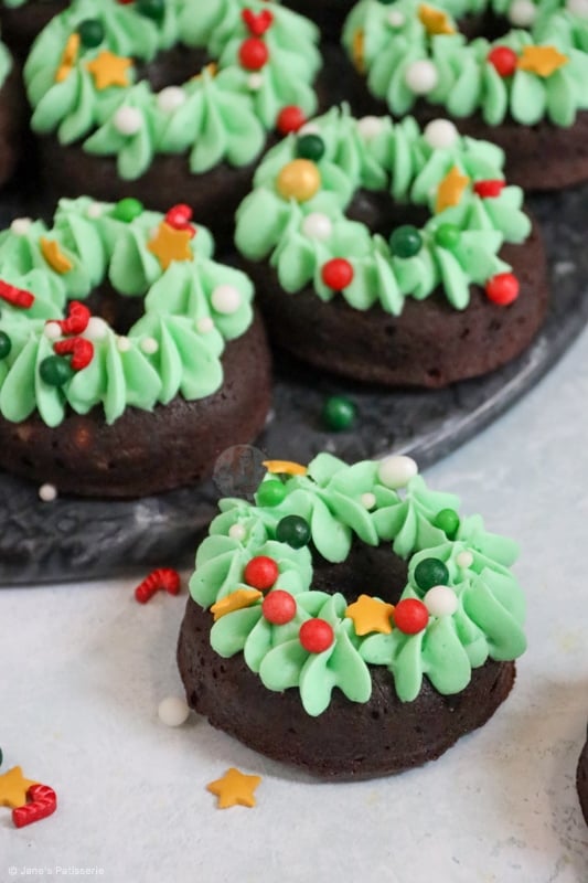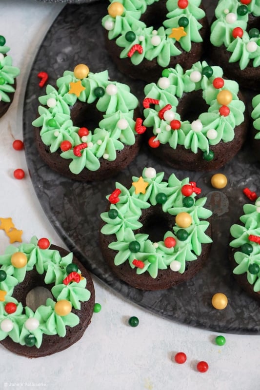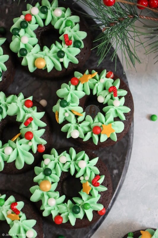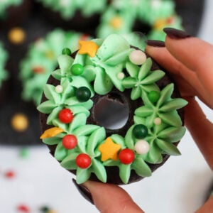 Delicious chocolate brownie doughnuts with chocolate chips, topped with green buttercream frosting and sprinkle baubles = christmas wreath bronuts!