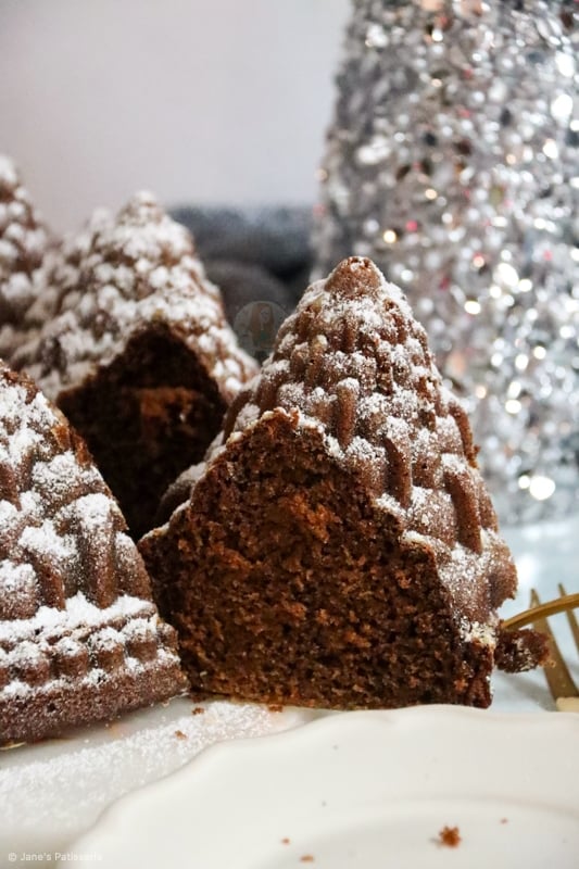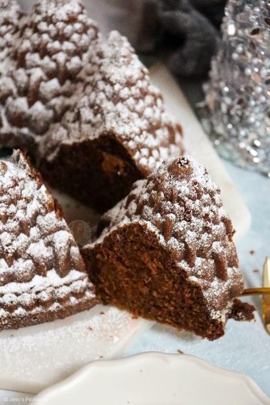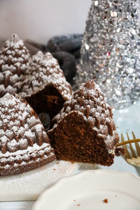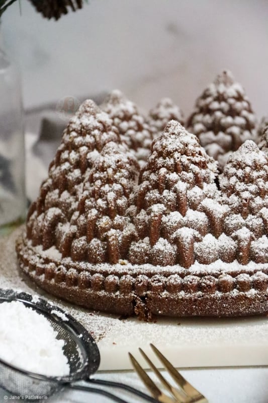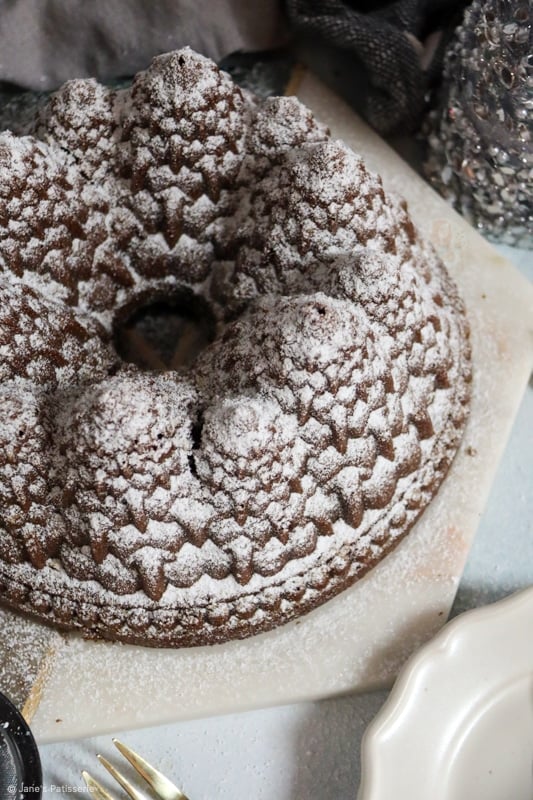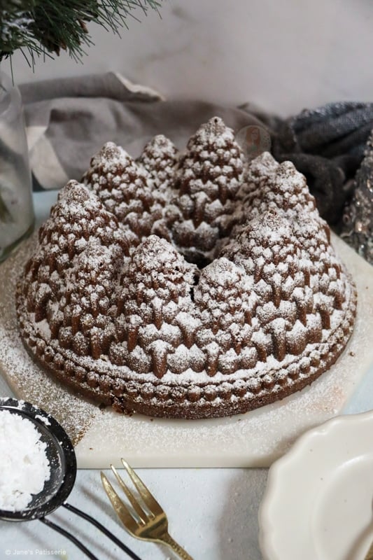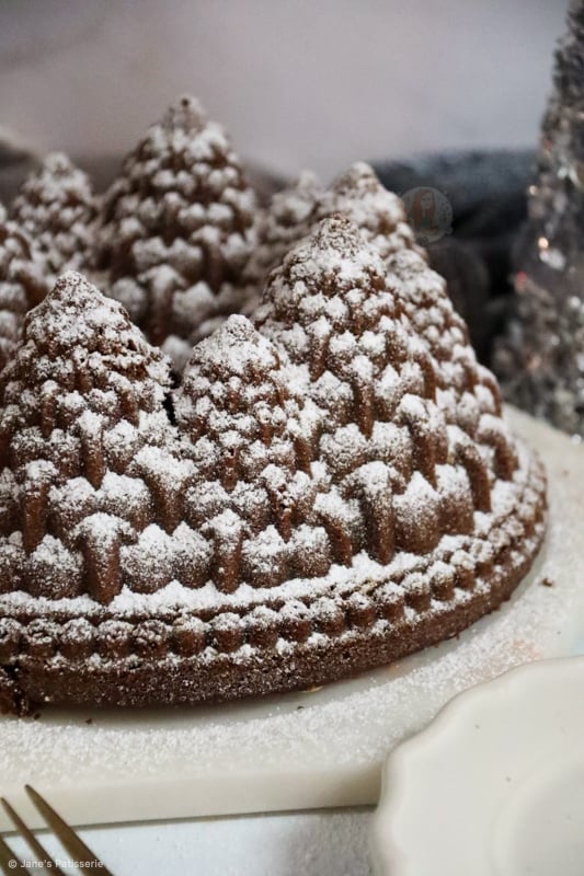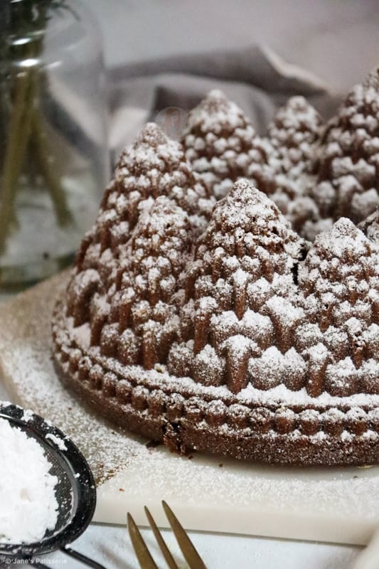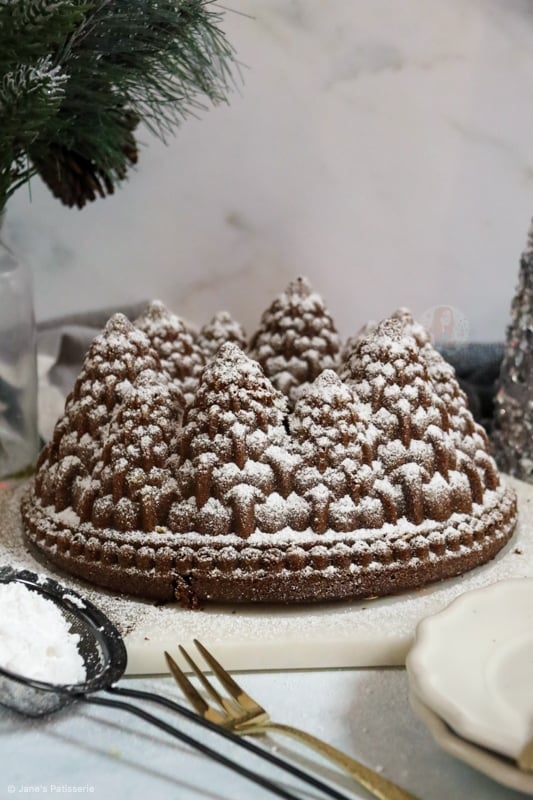 When it comes to bundt cakes, the tin is SO IMPORTANT. And as you can see from the images, I have used a beauuuutiful forest bundt tin – which you can find here. I used the forest tin because I thought with a little dusting of icing sugar for decoration it looked very festive so easily.