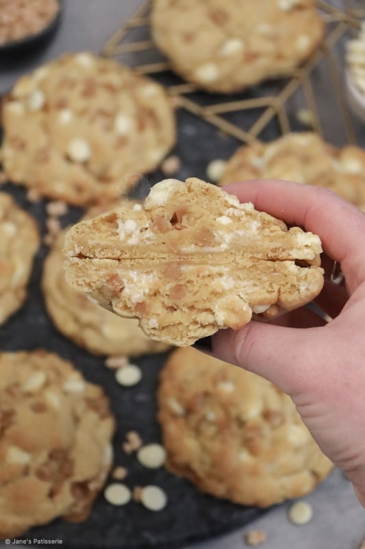 One thing about NYC Cookies is that they are huge… but this is what makes them NYC style! They are 120g of heaven. However, if you want to use the recipe to make regular size cookies (can’t call them NYC if you make them smaller…!), then you can make them 60g each, and bake for 8-9 minutes.