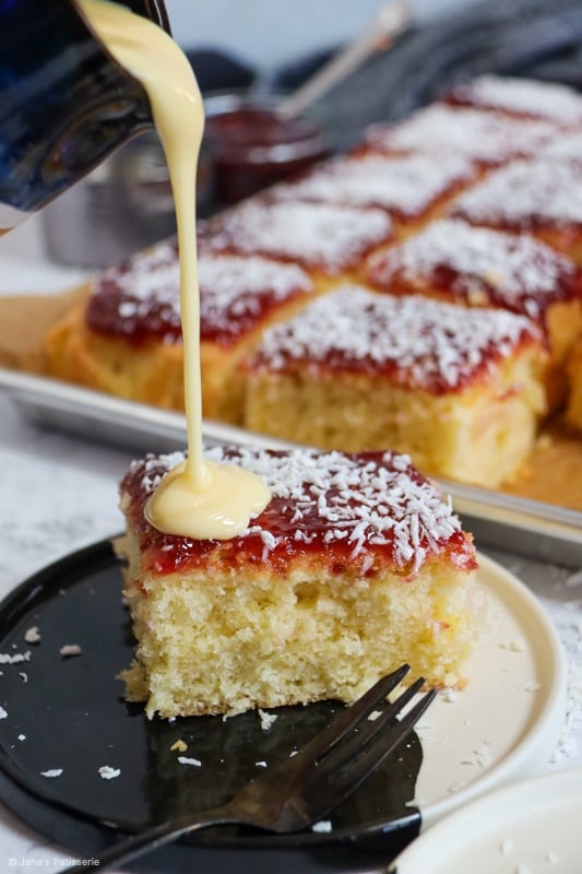 Delicious coconut sponge, raspberry jam (but obviously use your favourite!), and even more coconut on top served with a glue of custard… what more could you want?
