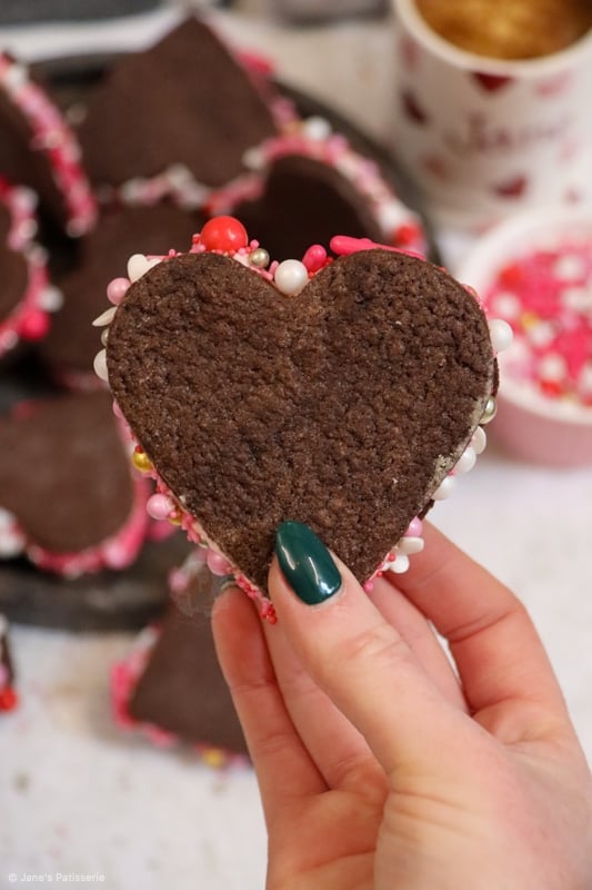 When making the cookies I found it super important to roll out the dough onto a lightly floured surface, otherwise they will definitely stick, and then lightly dunk my heart shaped cutter into a pot of flour as well each time. I also found that you do have to chill these cookies otherwise the dough can puff up slightly.