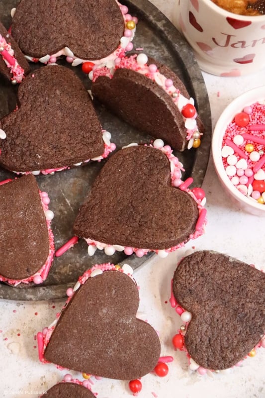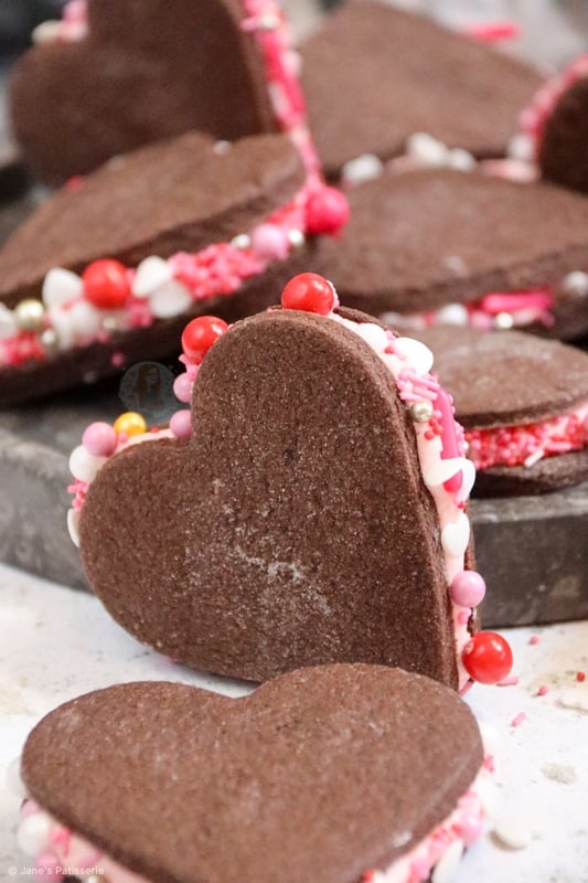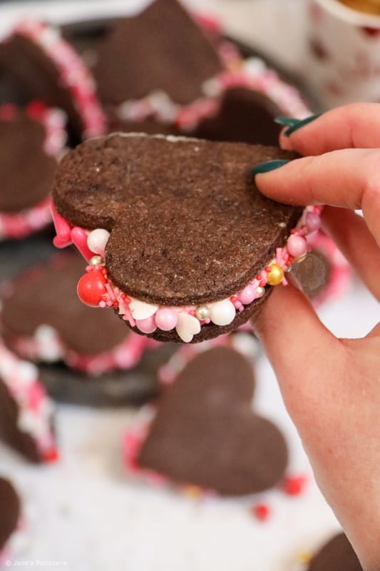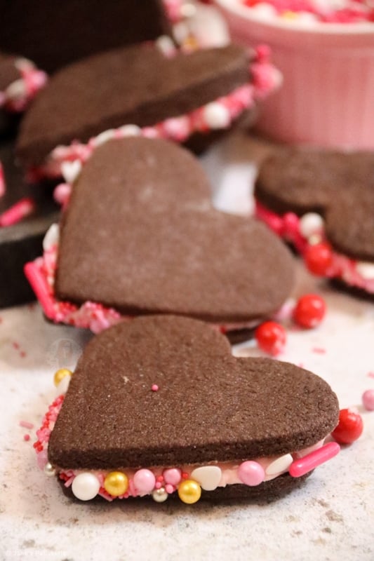 Delicious valentines sandwich cookies with a soft chocolate cookie, silky smooth frosting with sprinkles, perfect for Valentine’s Day!