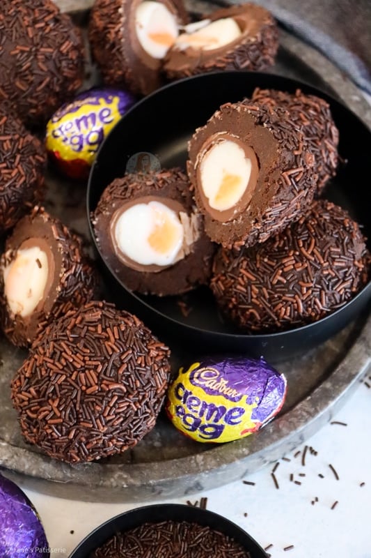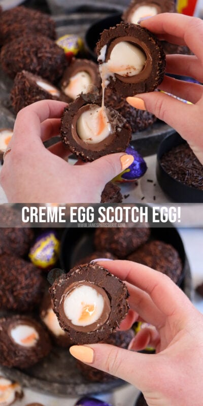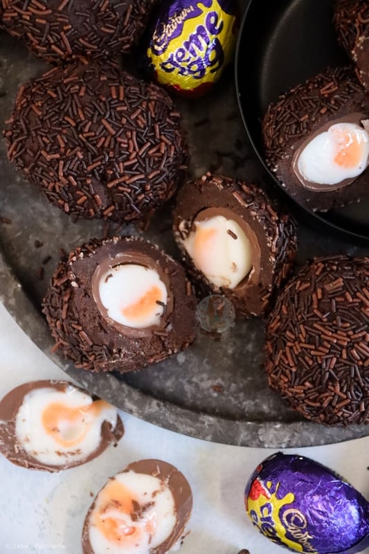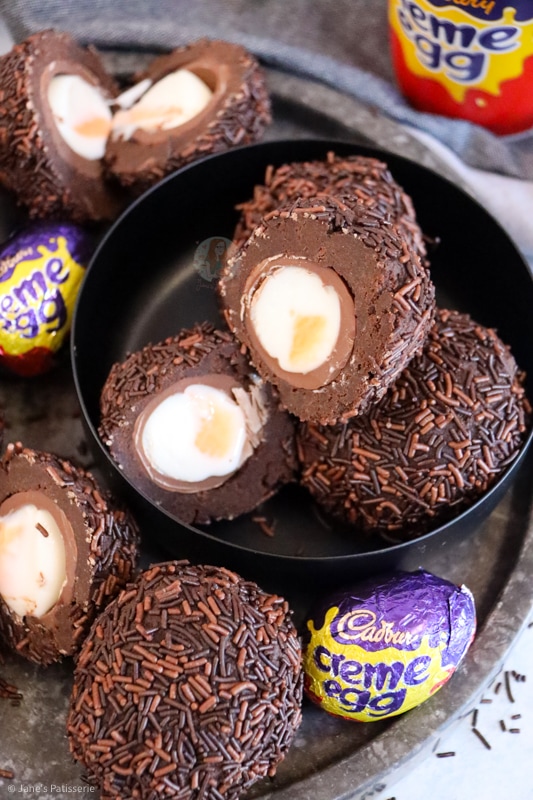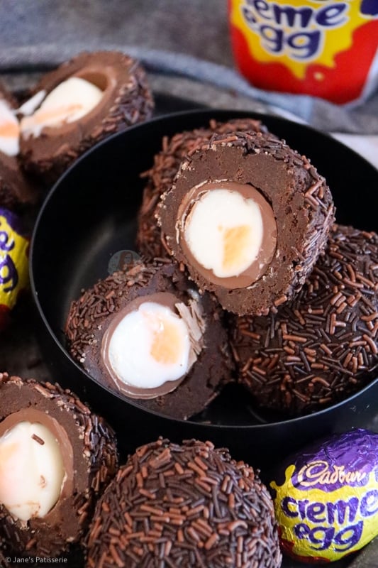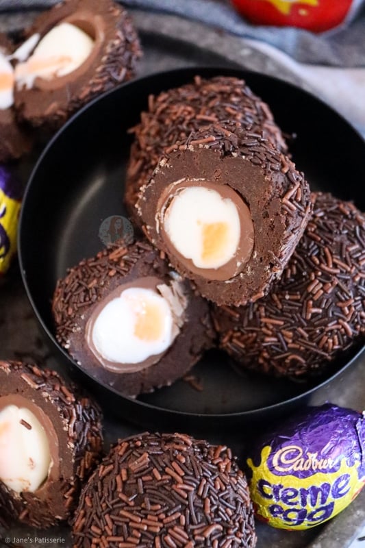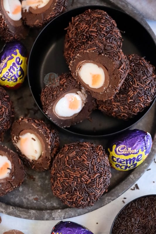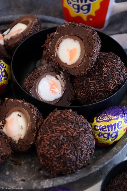 Delicious showstopping Creme Egg scotch eggs with a Creme Egg wrapped in homemade chocolate brownie and sprinkles!