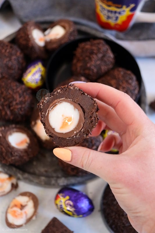 The batch of brownies does make more than the 500g of brownie you need, but that’s totally okay – you can freeze the rest, make your own brownie bites, or even just make a bigger batch of the Creme Egg scotch eggs if you preferred.