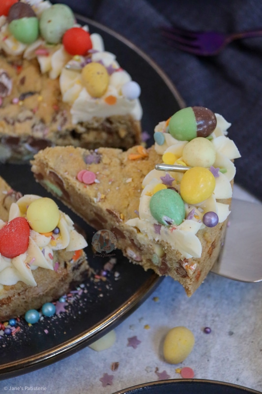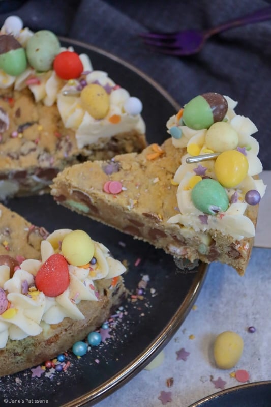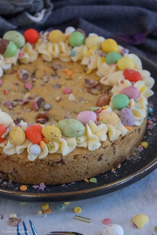 A delicious and easy to make giant easter cookie stuffed with easter chocolates, and decorated with buttercream and even more chocolate!