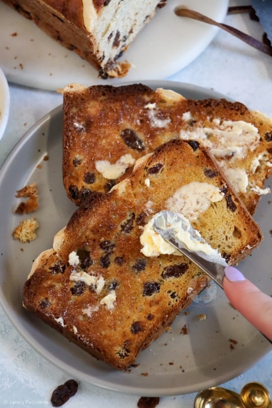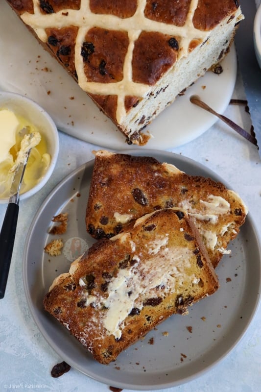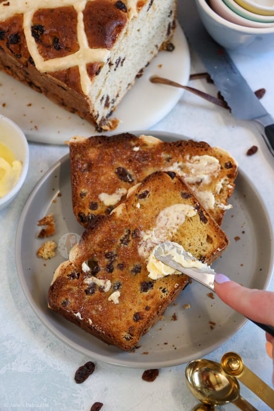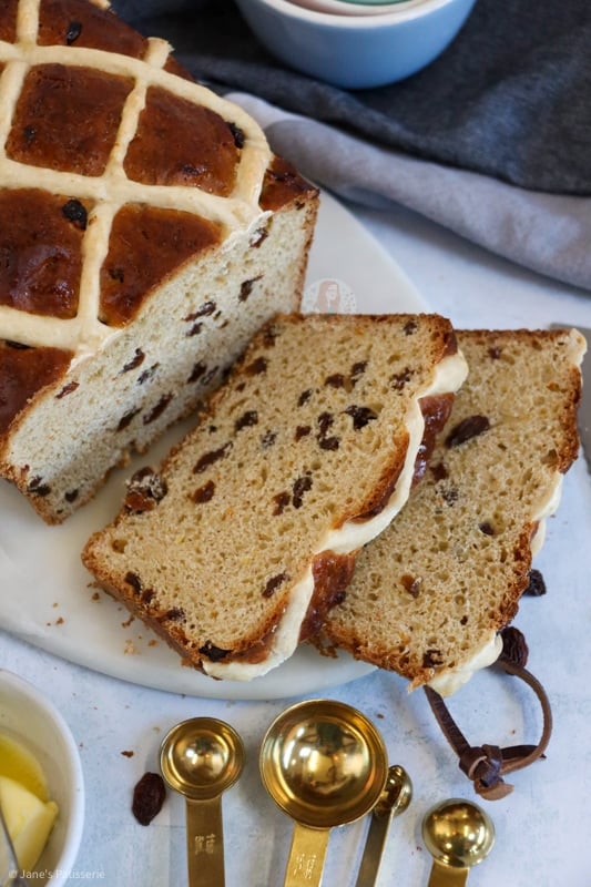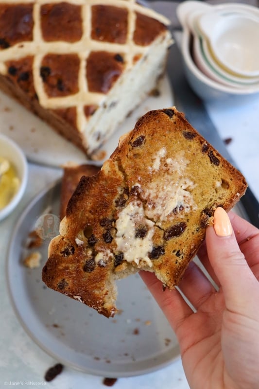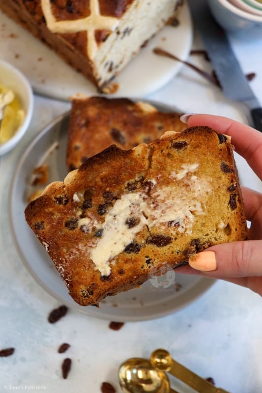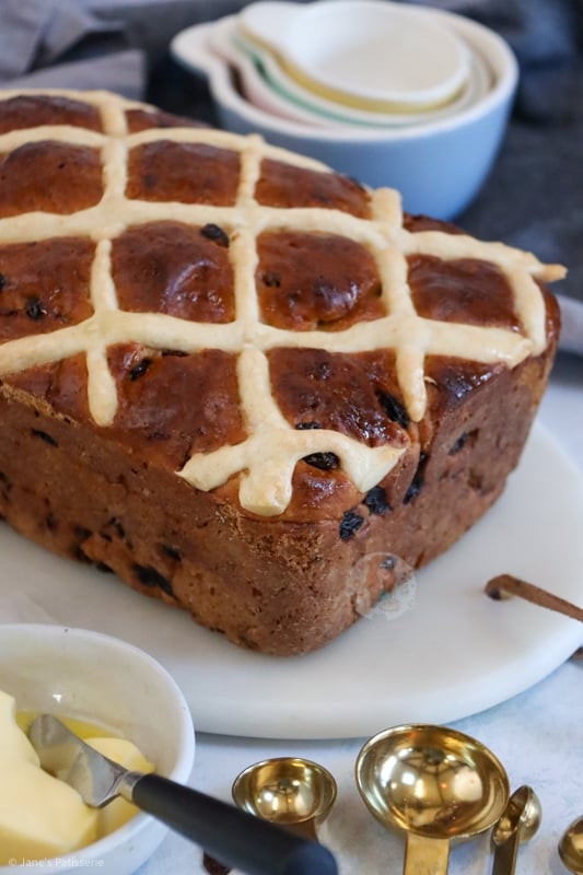 Hot cross buns are one of those bakes that are just so warming and heavenly, and I adore them. Whether they are shop bought or even homemade like my hot cross buns or chocolate hot cross buns, I am always in love with a warmly toasted hot cross bun, covered in butter. This hot cross loaf has the same desired effect, but it’s just even better!