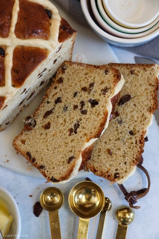 This hot cross loaf is based on a more classic flavouring as the original is the most iconic, but hot cross buns these days come in all sorts of flavours, so feel free to adapt it if you prefer. For example, as a lot of people don’t like dried fruit, you can use chocolate chips instead if you preferred.