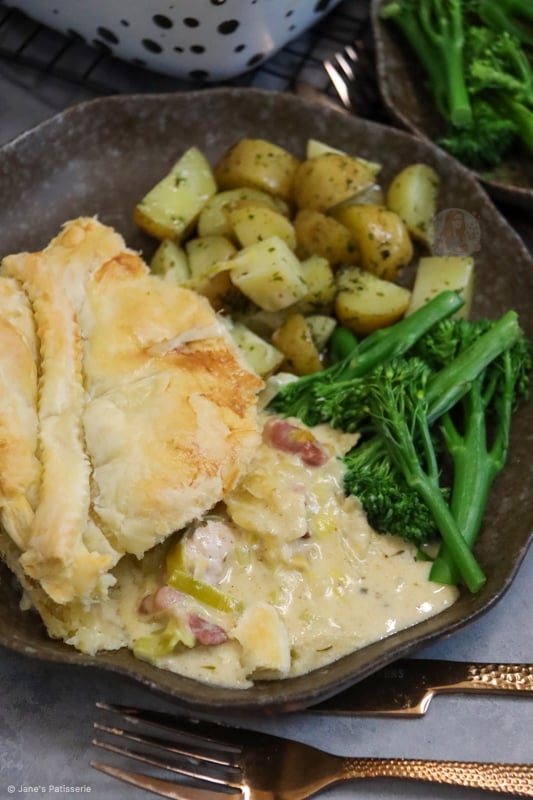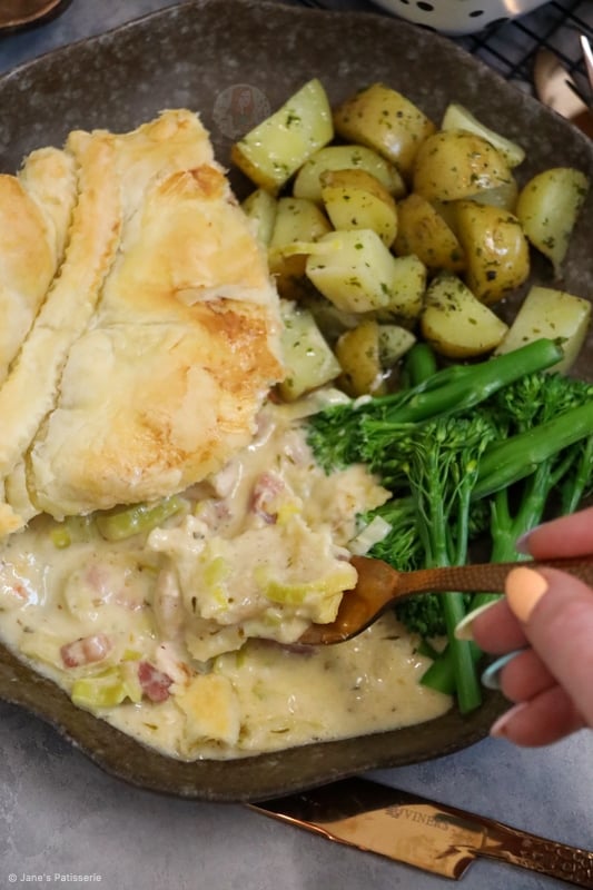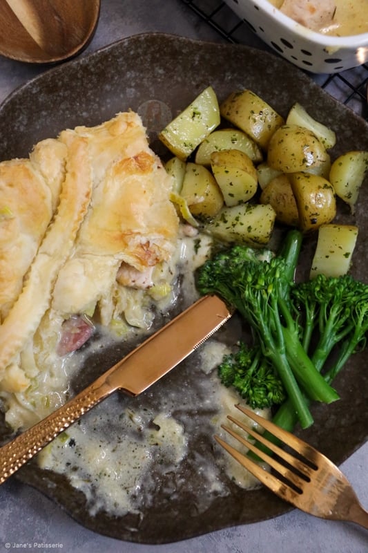 To be honest, even without make this a pie, this chicken, leek and bacon creamy sauce is ideal for other meals – serve with mashed potato, add pasta, and so on… so many dinner ideas with the delicious base to this recipe.