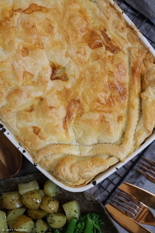Once this delicious chicken, leek & bacon pie is ready, you can serve it… salad, new potatoes, veg, roasties, whatever you want! It suits many side dishes.