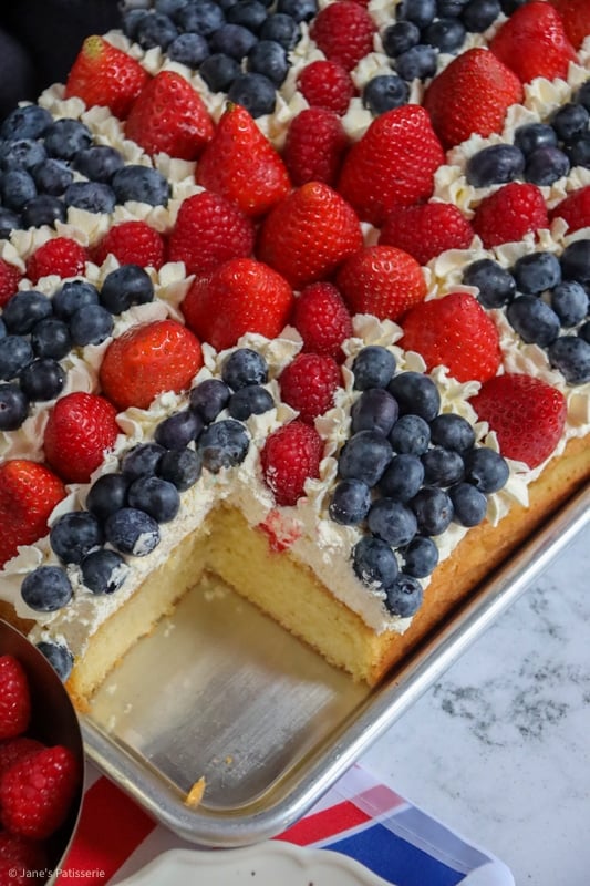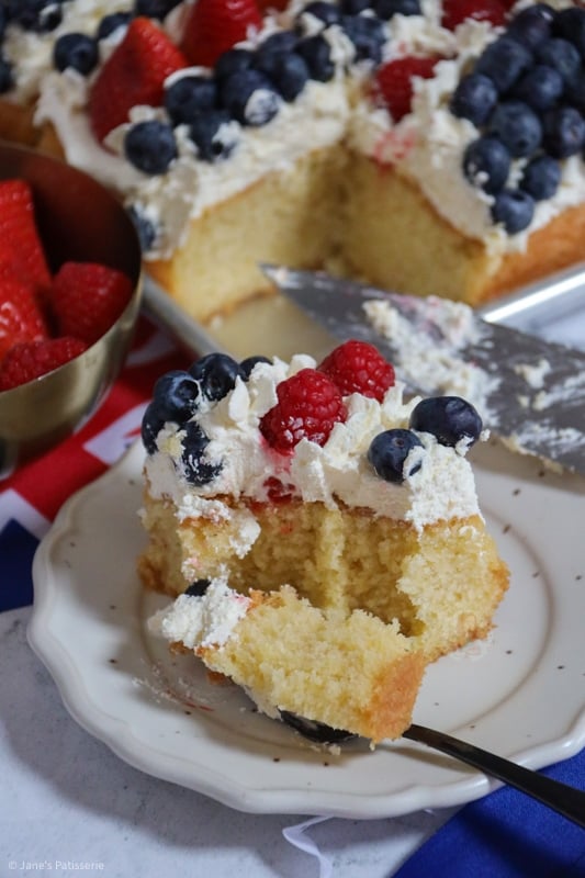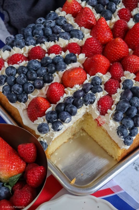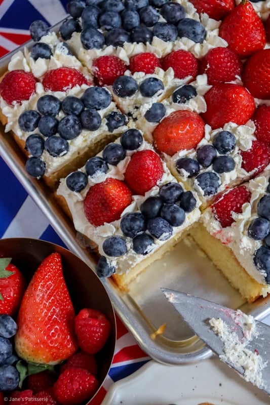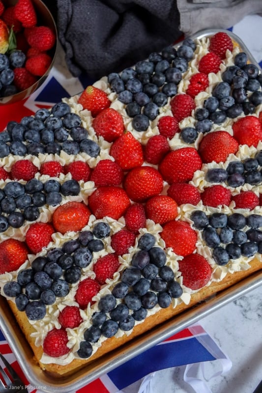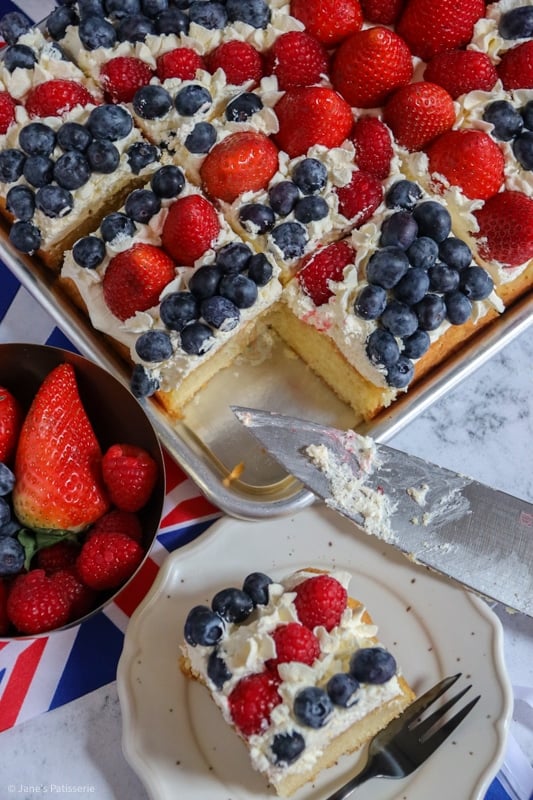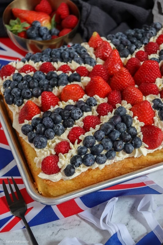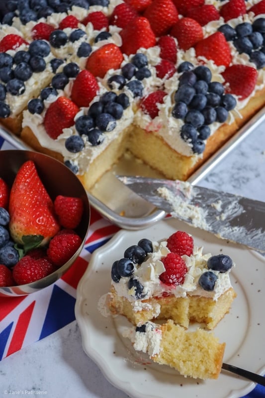 A delicious vanilla traybake cake topped with freshly whipped cream and berries, the perfect coronation cake for King Charles!
