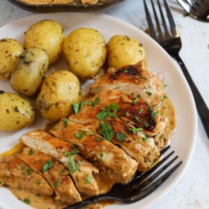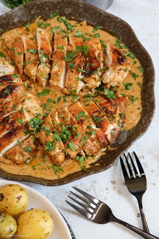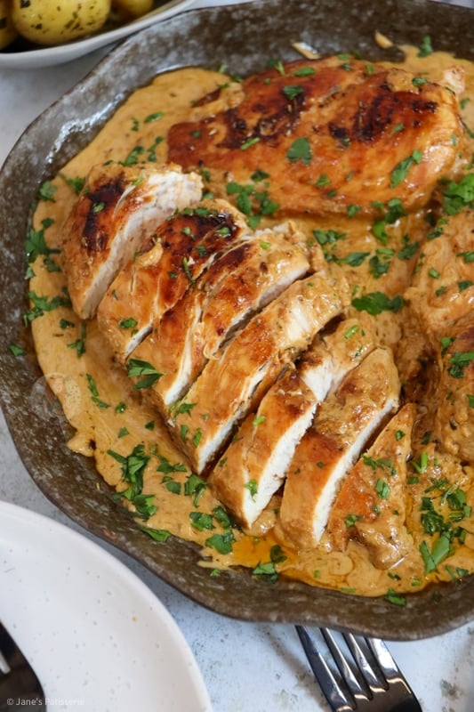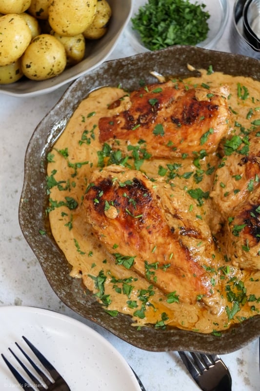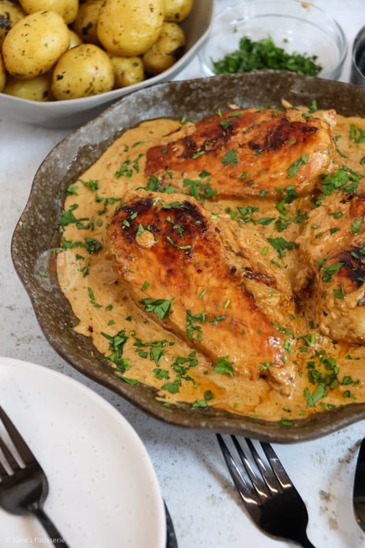 - Add the chicken to the serving plate, pour over the sauce and serve how you fancy - I added freshly chopped parsley and served with some herby new potatoes.